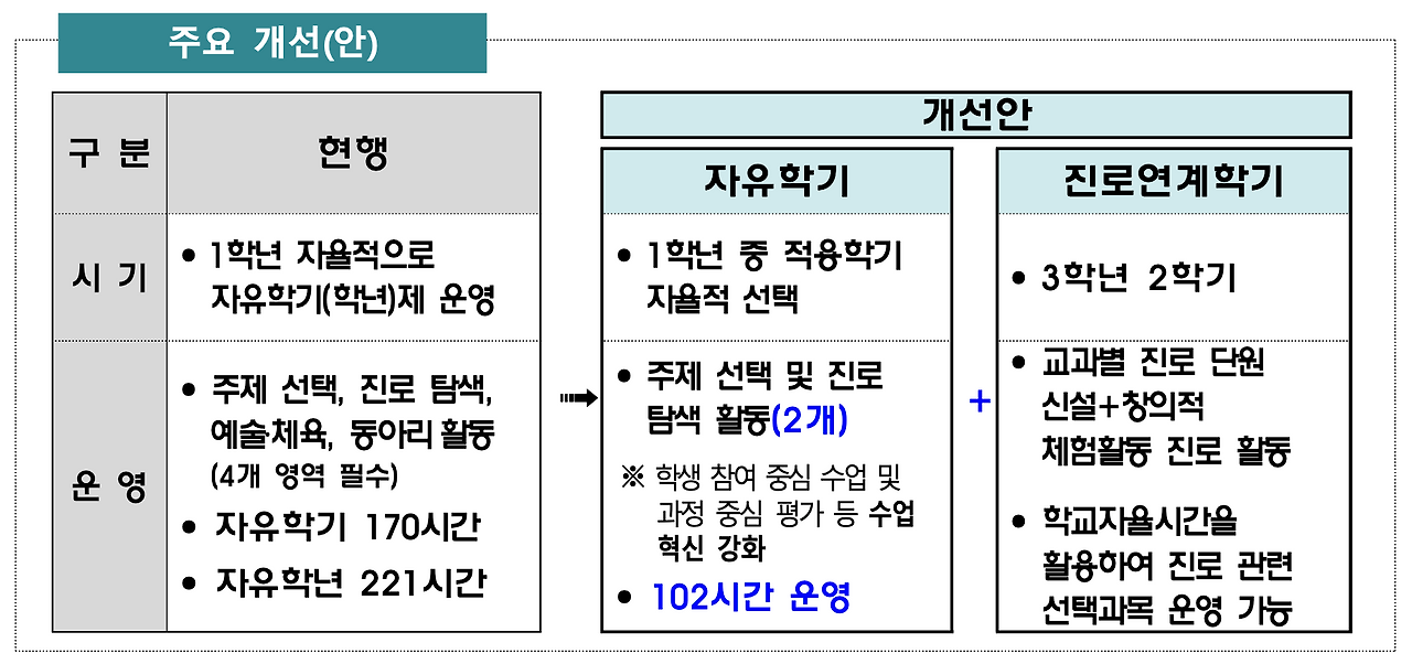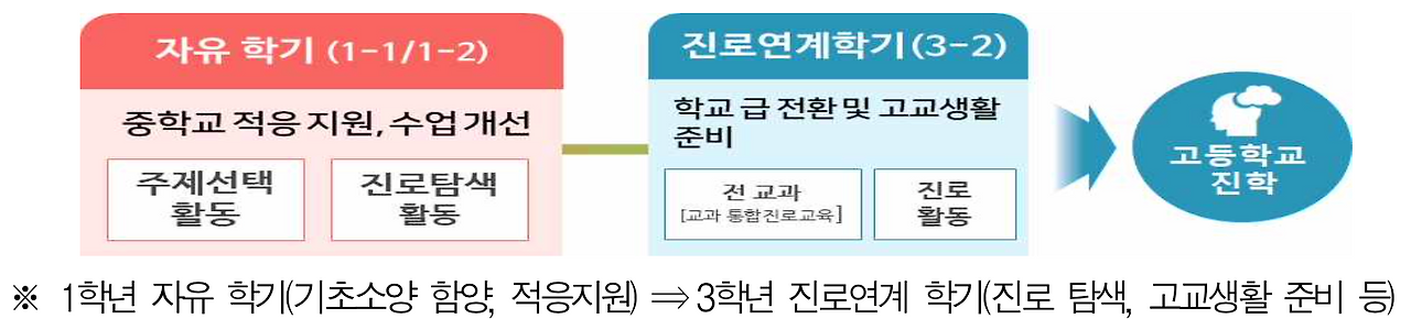 중학교 자유학년제는 보다 실효성 있는 운영방안으로 변화를 시도한다. 이 부분은 학부모의 요구가 반영된 것으로 느껴진다. 중학교 1학년 1년의 시간을 모두 자유학년제로 운영하는 것에 대한 학교의 부담과 학부모의 우려를 모두 반영하여 1학년은 1개 학기만 운영하고, 자유학기를 변형하여 3학년 2학기에 진로 연계학기로 운영하겠다는 것이다. 자유학기제 아이디어가 처음 도입될 때는 중3~고1의 시기를 염두에 두었지만, 진로에 따라 고등학교 진학을 결정하는 시기에 자유학기를 실천하는 학교는 거의 없었다. 결국, 중학교 1학년이라는 진로를 탐색하기에는 어린 나이에 자유학기(자유학년)가 운영되면서 실효성에 대한 의문이 제기되었던 것이 사실이다. 이 부분은 사회의 요구에 따라 유연하게 변화를 택한 것으로 이해된다.