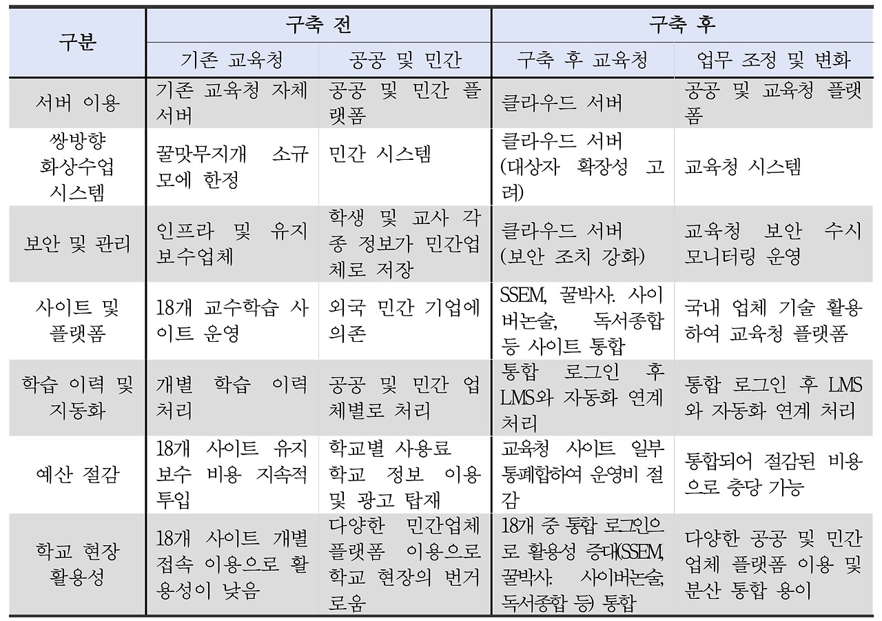 판이 깔렸다. 교사들은 자신의 수업 맥락에 맞는 플랫폼을 선택하여 수업을 설계하고 운영하기만 하면 되는 상황이었다. 레시피가 공개되고 요리도구까지 준 것이나 마찬가지였다. 하지만, 교사들의 입장에서는 선택 가능한 범위가 너무 컸다. 어떤 플랫폼을 사용해야 바람직한 것인지 교사들도 교육청도 판단하기 어려웠다.