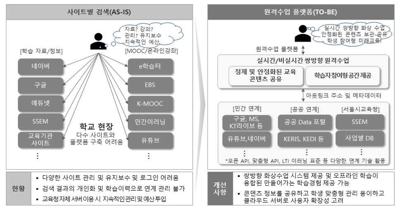 아니나 다를까. 2020.7.20. 서울특별시교육청은 보도자료를 통해 「원격수업 지원 통합 플랫폼 구축 계획」을 발표하였다. 관련업무를 담당하고 있지도 않고 원격수업 관련분야에 전문성도 없어서 명확하게 이해할 수는 없지만, 교육청 차원에서 플랫폼을 개발하고 있다는 것만은 분명한 듯 했다.