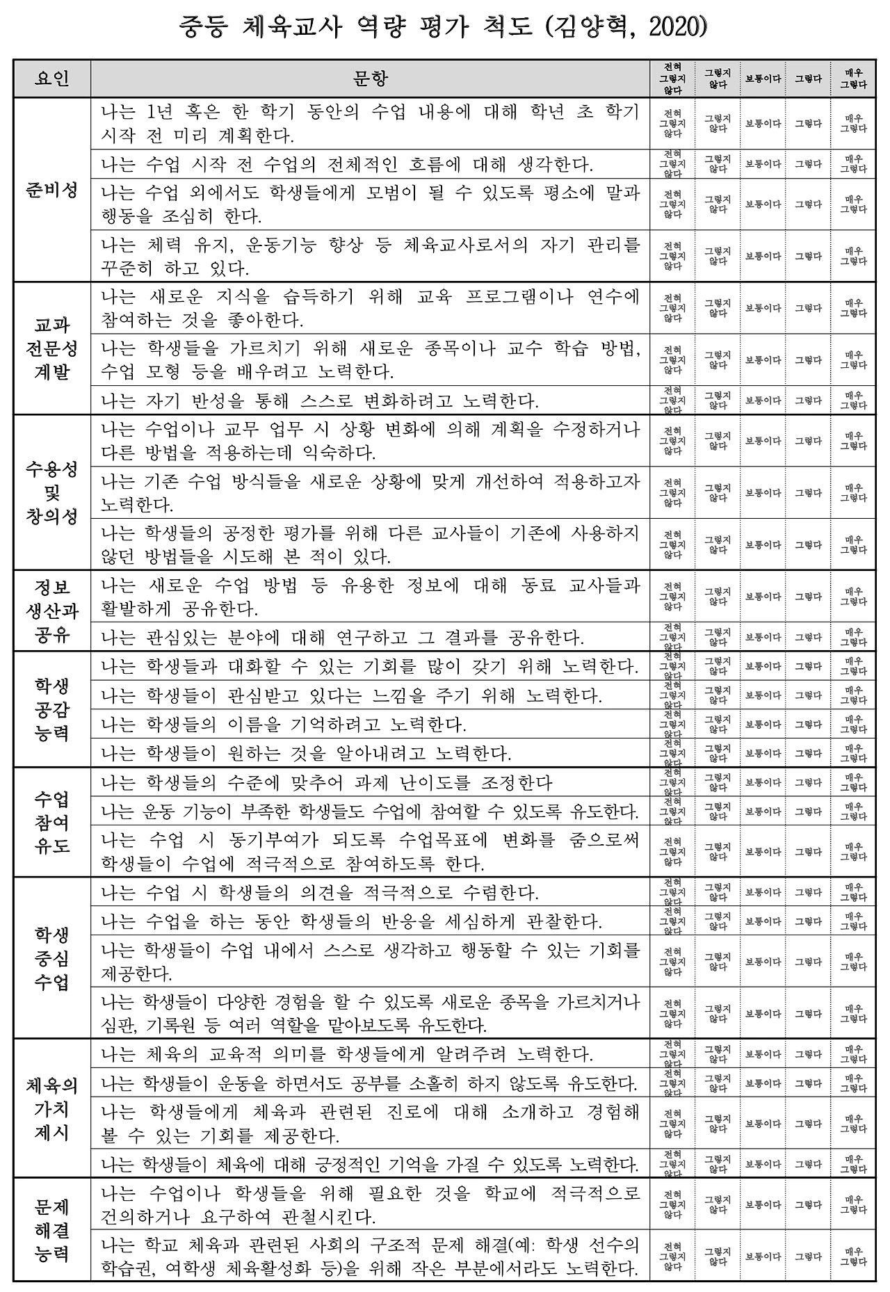 연구자는 '중등 체육교사 역량'의 9가지 하위 요소별로 2~4개의 평가문항을 완성하였다. 이렇게 완성된 평가척도는 총 29개의 문항으로 구성되었으며 그 내용은 다음과 같다. 다음의 양식은 연구 논문에 별도의 부록으로 제공되는 양식이 없어 논문의 내용을 종합한 것이다. 다양하게 활용되기를 바라면서 파일(HWP, PDF)도 함께 첨부하여 공유한다.