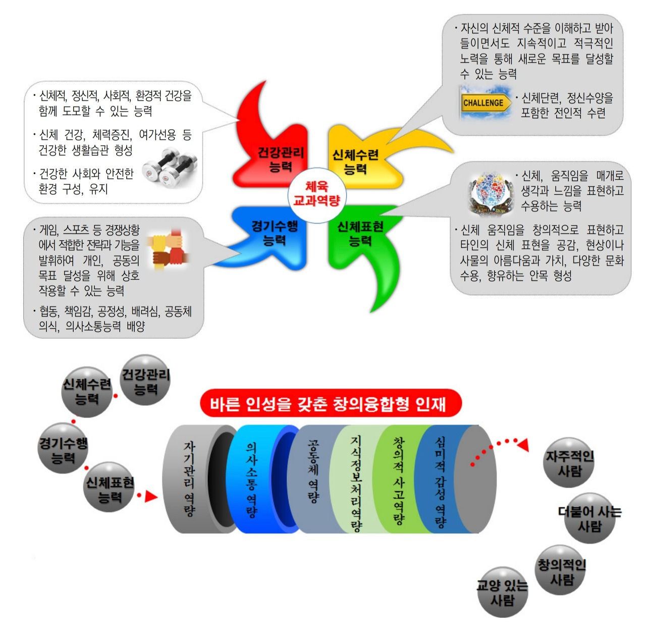 우리나라 체육 교과 교육과정(現 2015개정교육과정)은 역량 중심 교육과정을 지향한다. 학교교육의 헌장 역할을 하는 교육과정 총론에서는 일반적인 역량을 제시하고 있으며, 각 교과별로 세부적인 역량을 설정하여 총론의 일반역량과 동일한 맥락을 가지고 교과 수업을 할 수 있도록 구성되어 있다. 체육 교과 역량과 교육과정 총론의 일반 역량은 다음의 그림과 같이 연계되어 있다.
