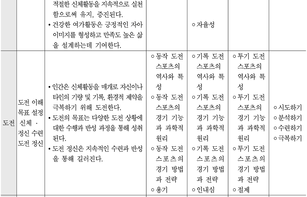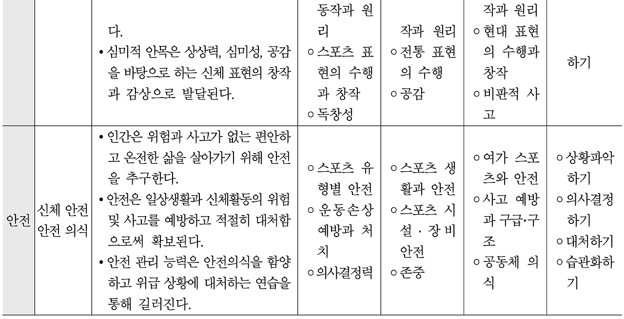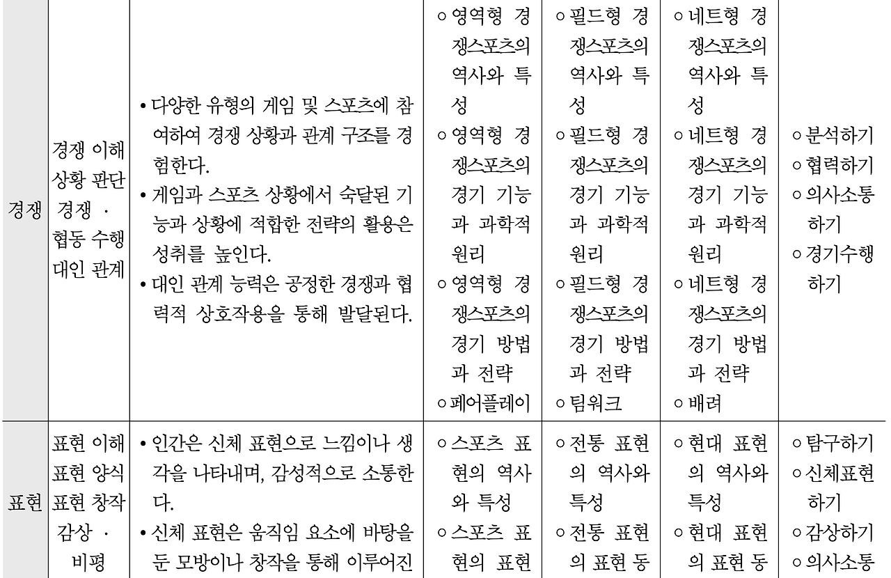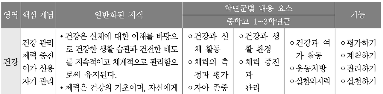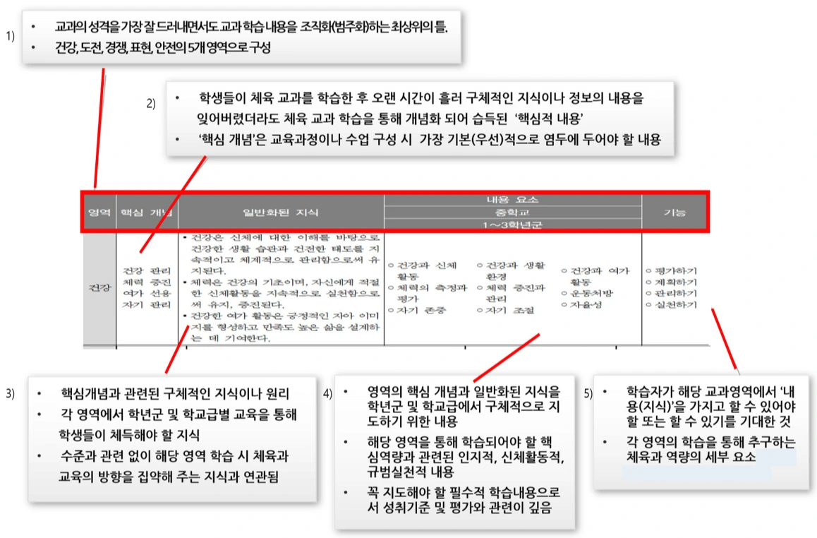체육 교과는 건강, 도전, 경쟁, 표현, 안전의 5개 영역으로 구성된 내용체계로 구성되어 있다. 각 영역은 '핵심개념-일반화된 지식-내용요소-기능'으로 체계화되어 있으며, 핵심개념과 내용요소 기능을 종합하여 진술한 것이 바로 각 영역별 성취기준이다. 중학교 체육 교과를 내용체계와 이를 바탕으로 종합하여 설정되는 성취기준의 구체적인 예시는 다음과 같다.