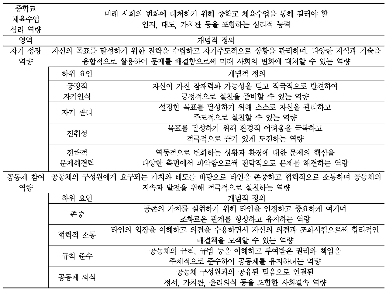 연구자는 중학교 체육 수업 심리역량을 '미래 사회의 변화에 대처하기 위해 중학교 체육수업을 통해 길러야 할 인지, 태도, 가치관 등을 포함하는 심리적 능력'으로 정의하고, 2개의 영역(자기성장 역량, 공동체 참여 역량)과 하위 요인 구조로 개념을 설명하였다. 구체적인 영역의 개념과, 영역별 하위 요인의 개념은 다음의 표와 같다.