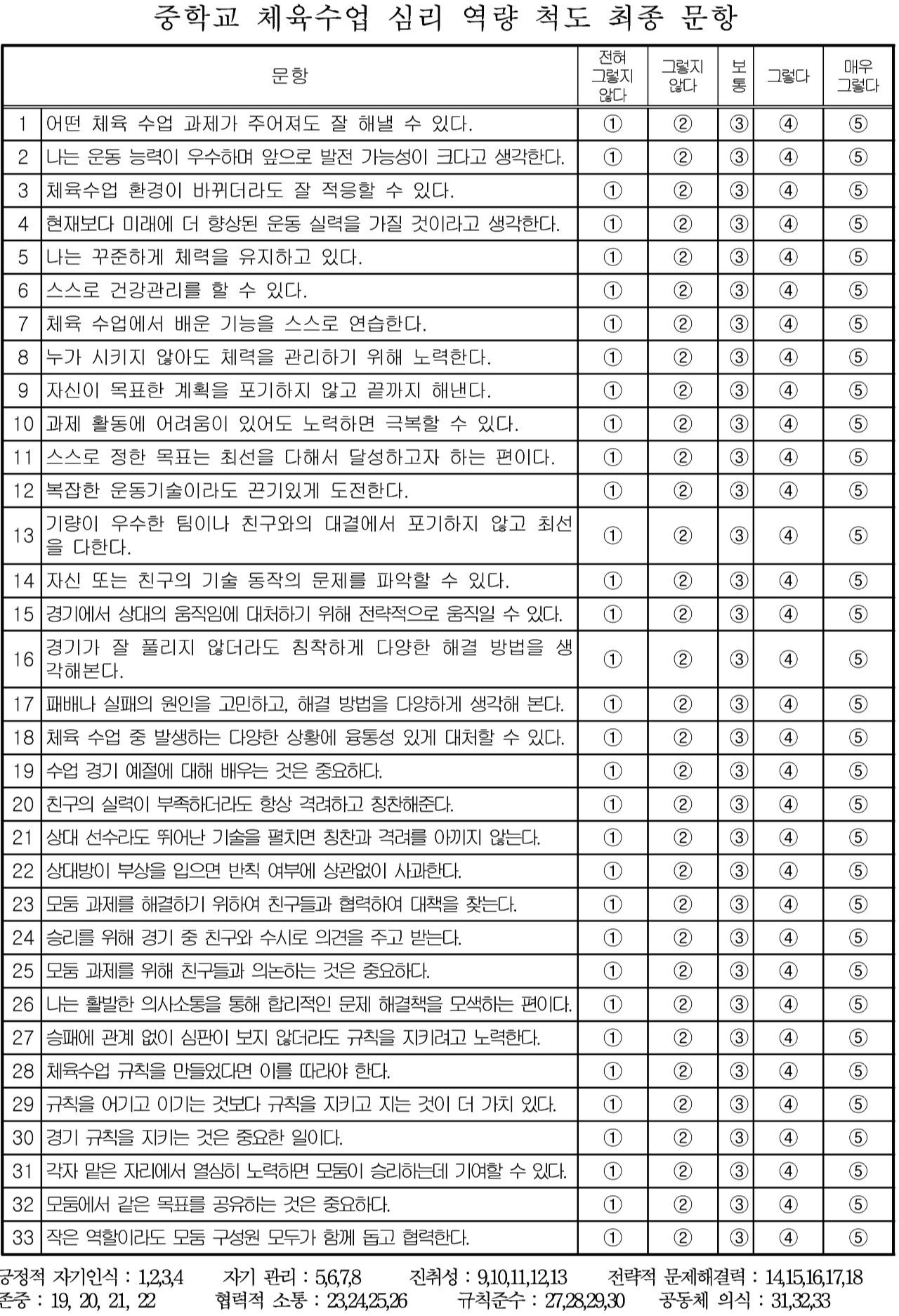 [ 문민권(2021). 중학교 체육수업 심리 역량(PEPC-MS) 개념 탐색 및 측정도구 개발. 한국체육교육학회지 26(3), 127-143. ] 다운로드 링크