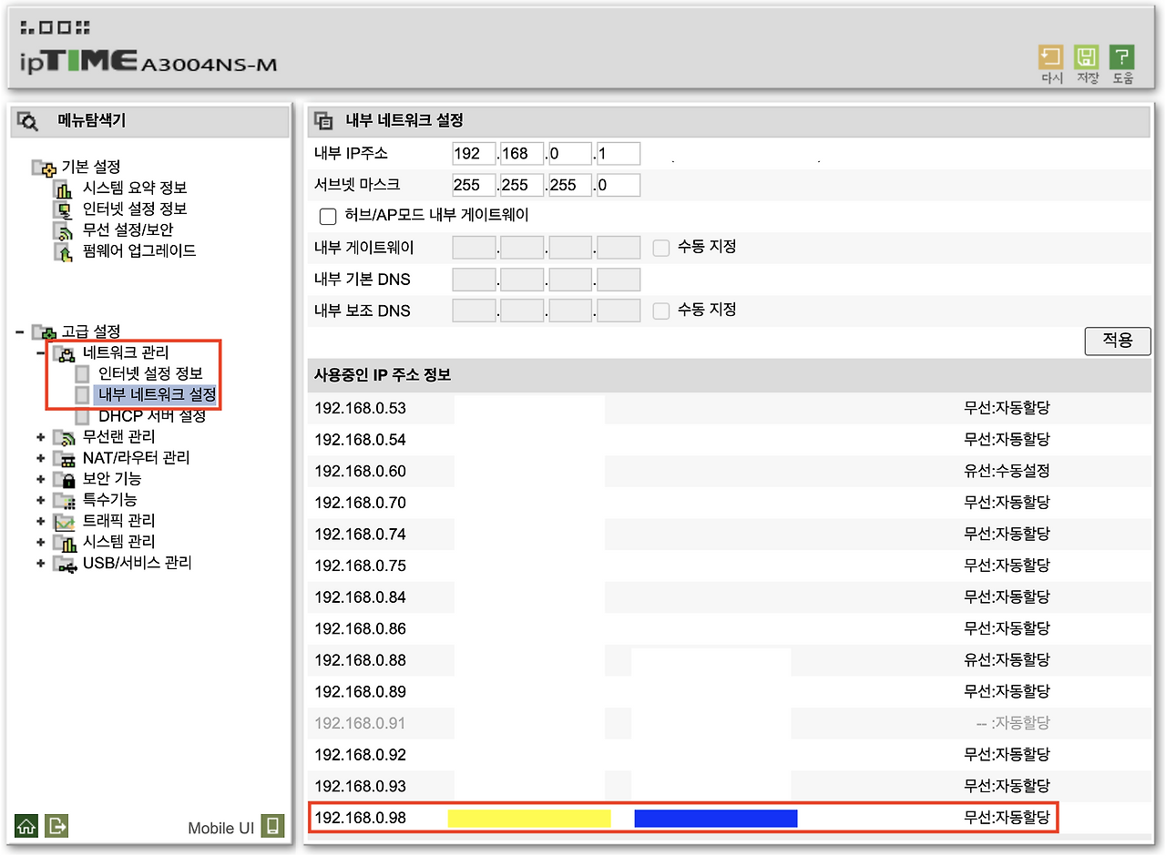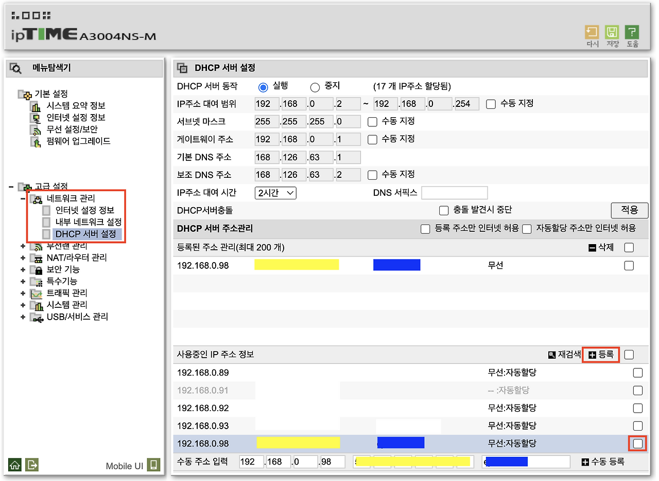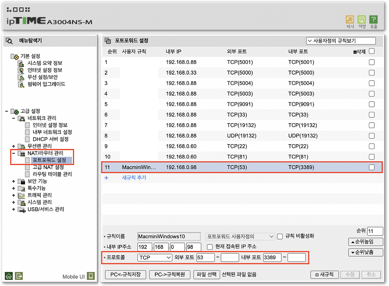 내부망(동일한 공유기에 접속된 경우) 사용 시에는 1번에서 설명한 원격 데스크톱 활성화된 PC 이름을 통해서 간단하게 접속하는 것이 가능하다. 하지만, 외부에서 접속을 하기 위해서는 몇 가지 공유기 설정(내부망 고정IP 부여 및 포트포워드 등)이 필요하다. 이미 NAS를 활용하고 있다면 해당 접속 주소(DDNS 서비스)를 포트번호만 달리하여 활용하면 된다. 공유기별로 DDNS 서비스를 제공하기도 하는데, 내가 사용하는 ipTime 공유기의 경우 간단한 설정만으로 [ 계정.iptime.org ]의 DDNS 접속 주소를 만들 수 있다. 외부에서 접속하기 위한 주소 설정이 되었다는 전제 하에 다음과 같이 공유기를 설정한다.