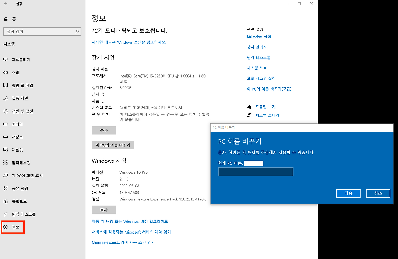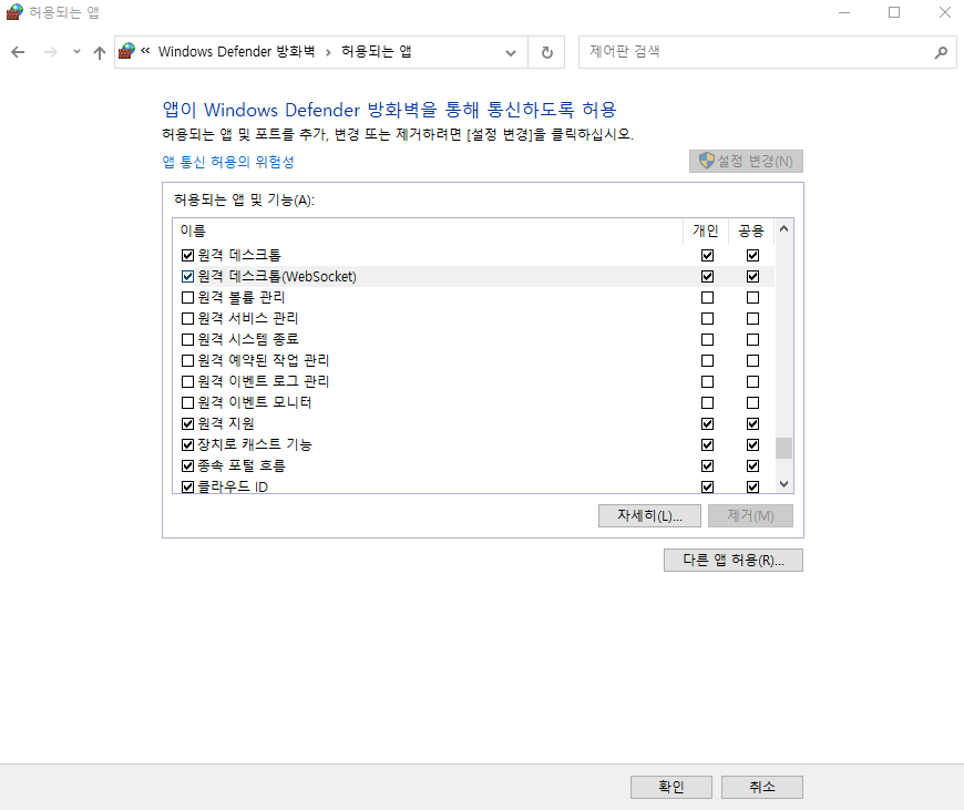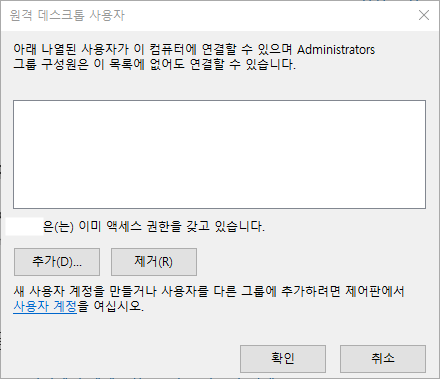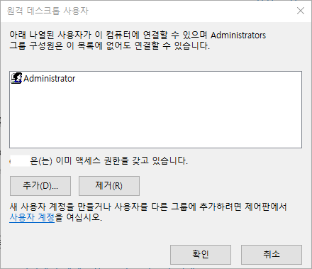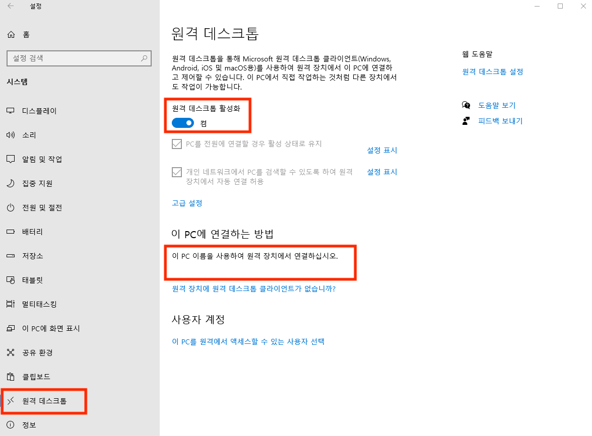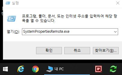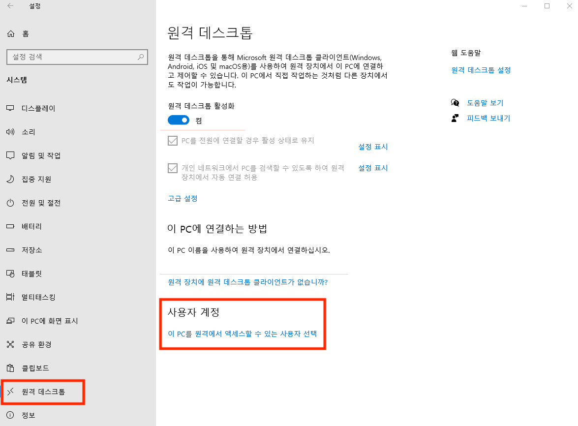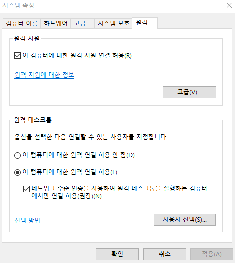 1. Windows 10 설치된 PC에서 원격 데스크톱 기능 사용을 위한 설정