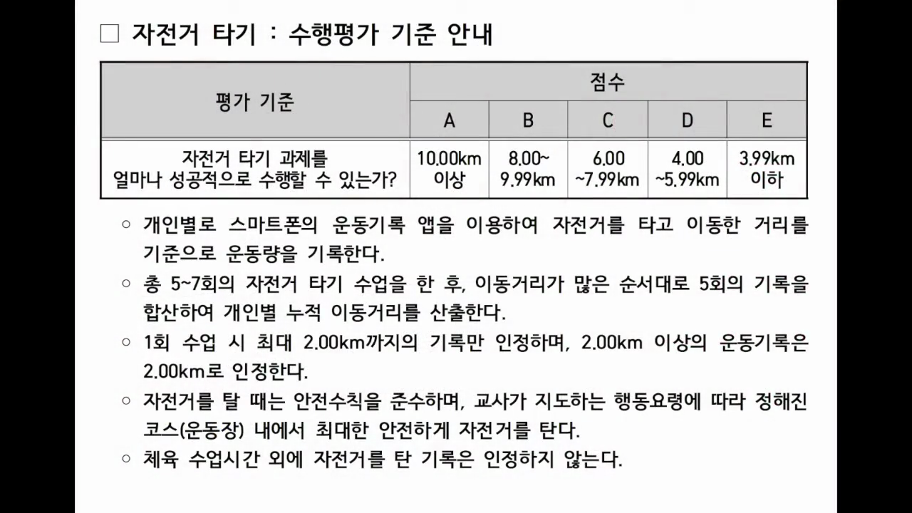 업이 업인지라 이러한 맥락을 학교 현장에 적용하는 것을 고민하게 된다. 디지털 테크놀로지 기반의 운동 기구와 시설 등의 가장 큰 장점은 정확한 기록이 자동으로 수집된다는 것이다. 물론, 현실적으로는 휴대전화 기반의 앱은 부정확성이 있을 수밖에 없다. 움직임 센서 기반의 만보측정 앱의 부정확성이나 20m 이내의 거리에서는 정확도가 감소할 수밖에 없는 GPS 기반 앱의 한계 등이 바로 그것이다. 그런데, 시간이 지나면 지날수록 그 정확도가 향상되고 있으며 고가의 시스템이 필요하던 일들을 추가비용 없이 간단하게 할 수 있게 되기도 한다. 시간이 지나면 지날수록 이런 경향은 더 커질 것이다. GPS 기반의 움직임 기록 앱을 활용한 장거리 달리기 수업이나 자전거 수업 등은 십여년 전에도 가능했고 충분히 정확했었다. 2010년대 중반에 많은 학교에서 이런 방식의 수업을 시도했고, 나 역시 다음과 같은 방식으로 수업을 운영하고 평가까지 했었다.