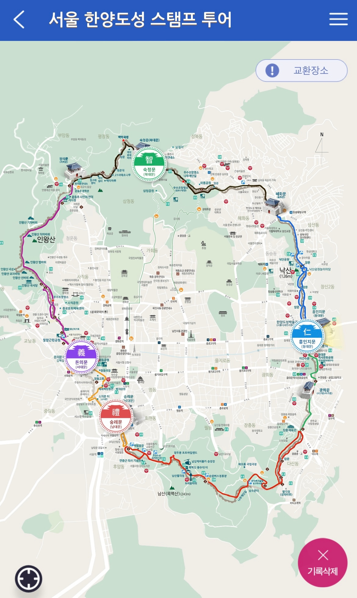 코스: 숭례문 - 인왕산 - 백악산 - 낙산 - 남산 - 숭례문