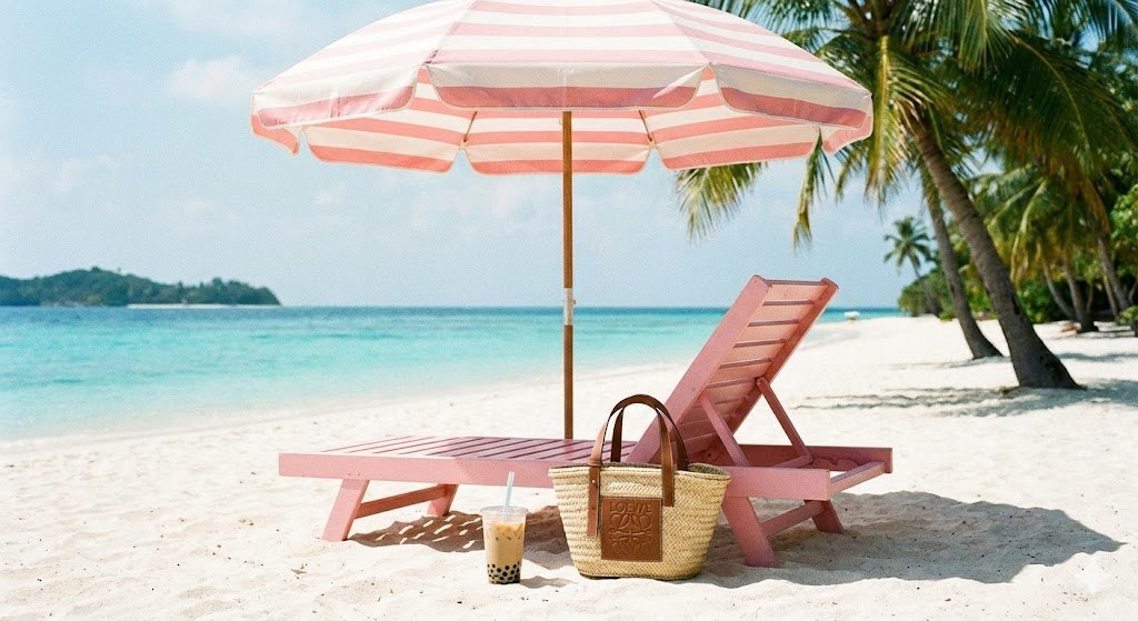 midday shot of a beachside pink umbrella, matching lounger, designer tote bag and iced boba tea on the sand, bright light, chic composition, tropical beach background