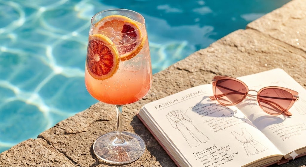 pink drink with citrus slices, beside a fashion journal and rose-tinted sunglasses, pool edge backdrop, sunny and vibrant, sparkling water texture, macro shot