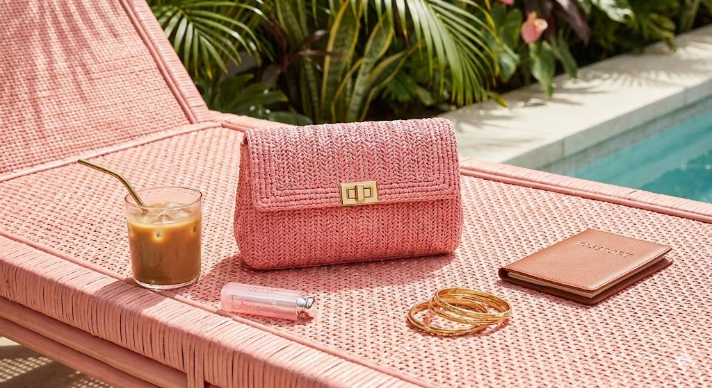 flat lay of vacation accessories: iced coffee, pink lip gloss, gold bangles, passport, and a woven pink clutch on a sunny pink daybed, tropical hotel setting, high end aesthetic