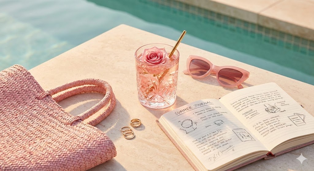 glamorous pink drink flat lay on a poolside table, pink sunglasses, pink straw bag, summer journal, gold rings, warm light, clean composition, hyper-realistic, high detail, 8k resolution