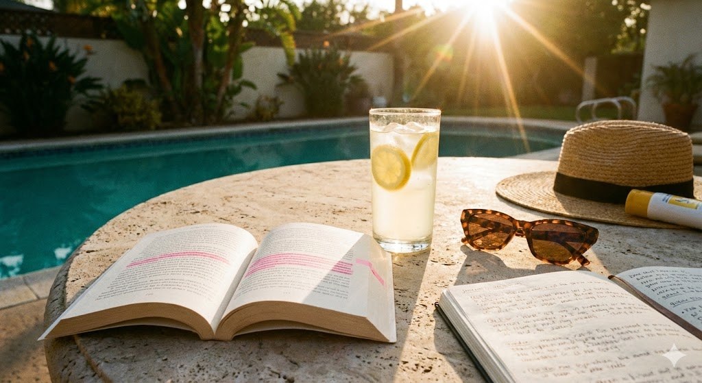 poolside book scene with pink highlighter, iced lemonade, stylish glasses, and open journal, slow summer content moment, sun flare, relaxing atmosphere