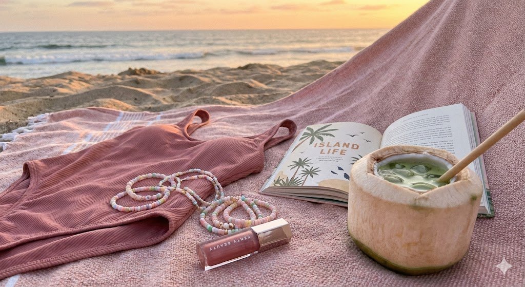aesthetic flat lay on a pink-tinted woven towel, pink swimsuit, beaded jewelry, glossy lip gloss tube, open tropical-themed book, and iced matcha in a coconut, soft sand and ocean blur in background, sunset glow
