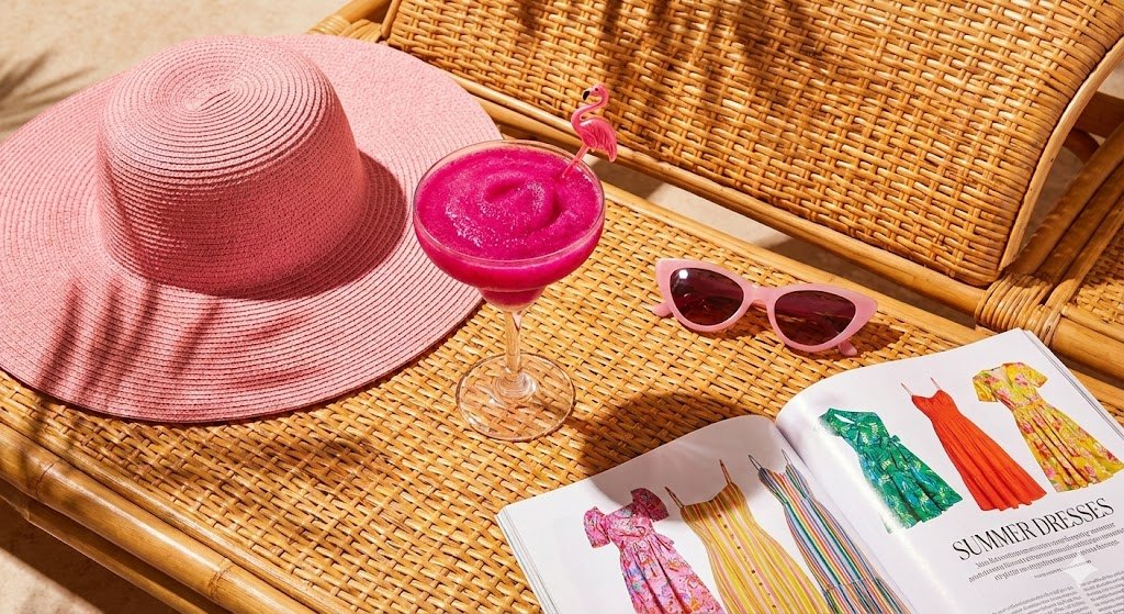 라탄 라운지 의자 위에 놓인 핑크 선글라스, 패션 잡지, 플라밍고 머들러가 꽂힌 냉동 용과(드래곤후르츠) 음료, 그 옆에 놓인 핑크색 썬캡(모자), 햇빛이 드리운 그림자, 생생한 색감