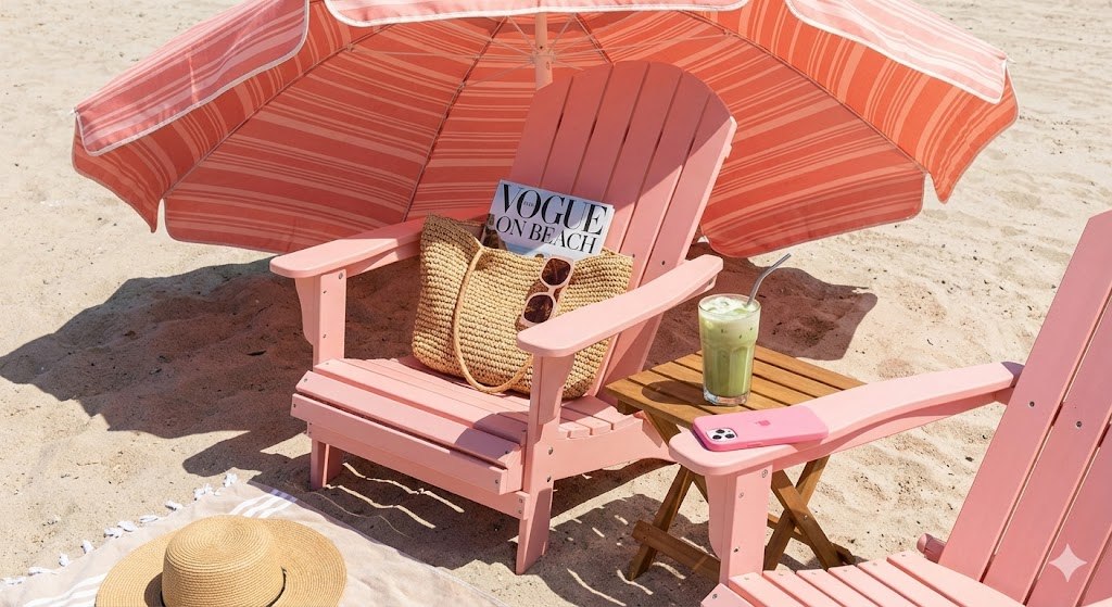 beachside pink chair setup with a straw tote, fashion book, iced matcha, and pink iPhone, all under a pink sun umbrella, lifestyle content scene, bright daylight, sandy texture, cinematic composition