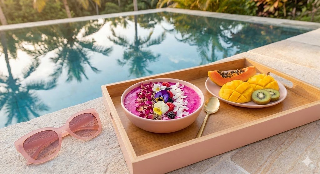 blush-toned breakfast tray poolside, pink smoothie bowl topped with edible flowers, gold spoon, tropical fruit slices, oversized pink sunglasses resting nearby, palm reflections in water, soft natural lighting