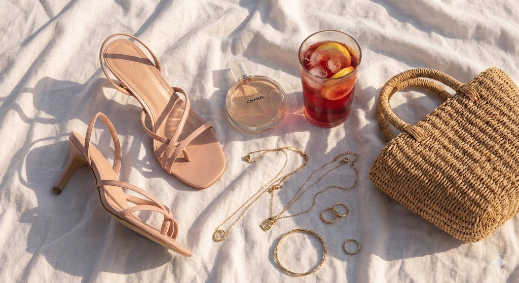 fashion-focused flat lay: pink strappy heels, designer perfume, iced drink, straw bag and gold jewelry on a white linen towel, aesthetic lighting, soft shadows, detailed texture
