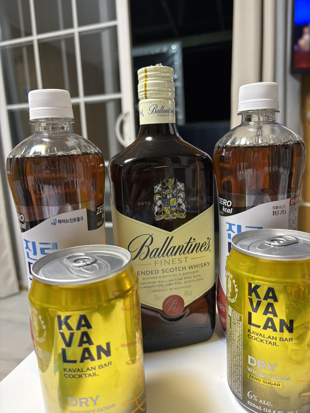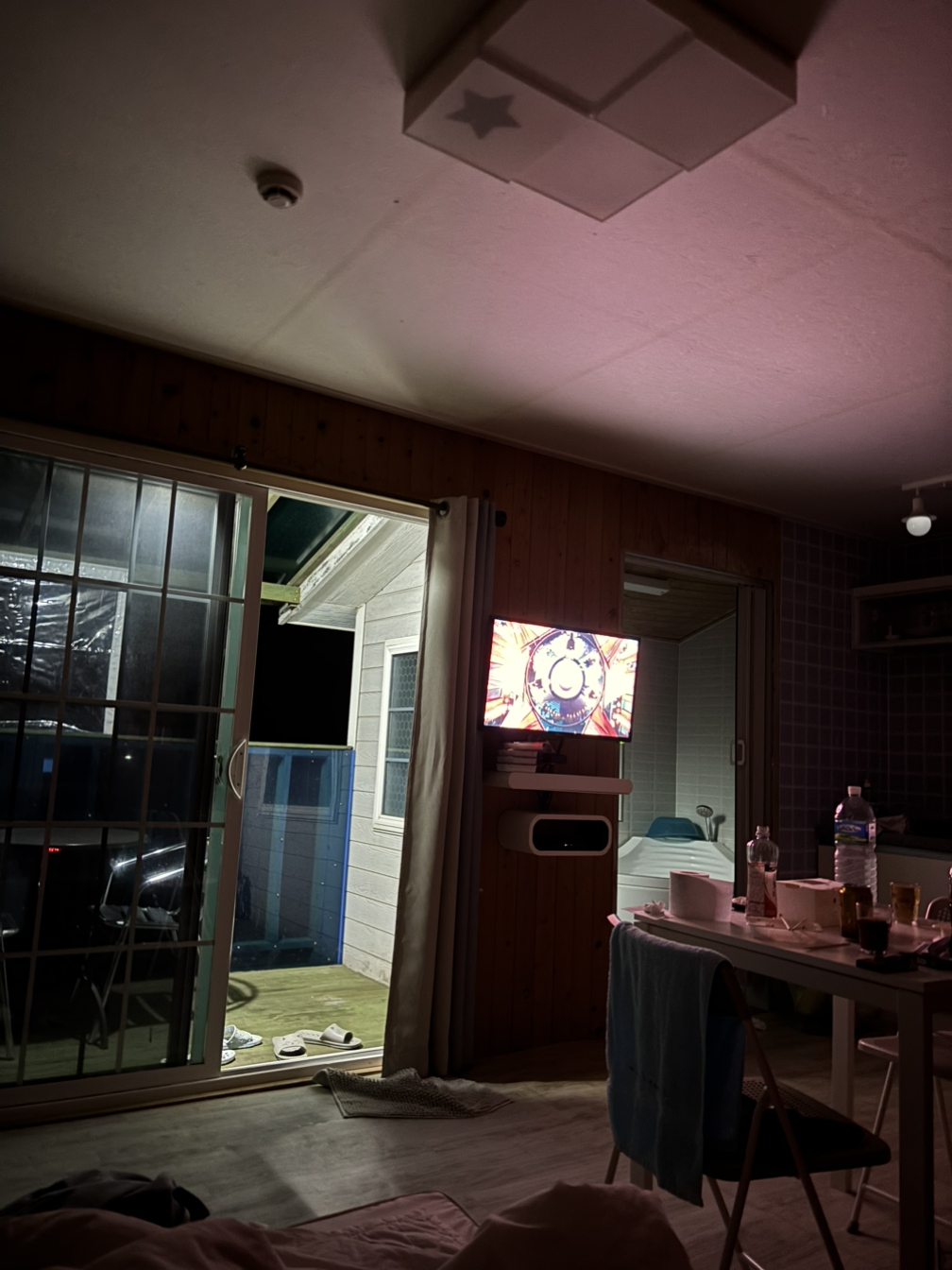 밤엔 조용히 술 마셨다. 위스키, 탄산수, 분위기.라이터도 안 켜지는 조명 아래 우리 둘 다 폰 들고 이상한 사진찍다가 그냥 픽 웃고, 심야괴담회 보면서 또 한잔.