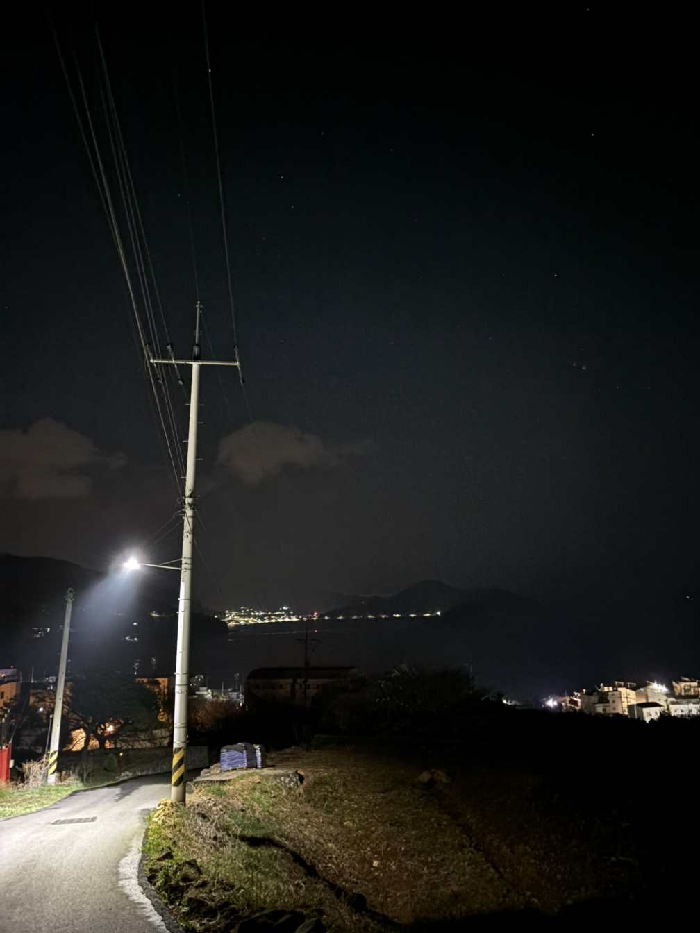 별도 안 보이는 어둠 속에서 사진 하나 찍는 모습이 이상하게 따뜻했다. 산책길에서 봤던 전깃줄과 벚꽃, 그리고 바다. 우리 둘 다 말 없이 멈춰 서 있었다. 서로 사진 찍어달란 말도 안 했는데, 그 장면을 같이 바라봤다는 것만으로 충분했던 시간이었다.