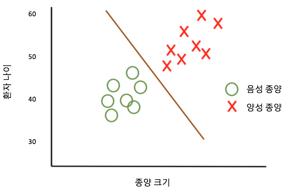 이제 분류 분석의 예를 보겠습니다. 이번엔 의료학 예제 표를 보시죠 - 역시 두 가지 데이터가 있습니다 - 종양의 크기 (x)와 환자 나이 (y). 종양은 양성 및 음성 종양으로 분류됩니다. 감독된 분류 알고리즘은 데이터를 통해 직선을 맞추어 종양을 두 개의 다른 분류로 분류하려고 시도합니다. 선에 따라서 이후에 추가되는 데이터는 직선 분류에 따라 양성 또는 악성으로 분류될 수 있습니다. 분류 분석에선 개별 그룹이 발생하지만 반드시 출력 그룹 수를 제한할 필요가 없습니다. 예제에선 두 개의 그룹 (음/양) 만 있지만 더 많은 분류 (양성, 유형 1 악성, 유형 2 악성 등)가 있을 수 있습니다. 기본적으로 데이터를 정해진 기준에 따라 그룹으로 나누는 경우이겠고, 크게 두 가지로 볼 수 있습니다 - 2진법 (binary - yes/no)을 쓰는 경우에 '양성 종양 확률이 높은가?' 하는 문제에 답할 수 있는 체제가 되겠고, multi-label classification을 쓰는 경우에 양성 및 다른 유형으로도 그룹 지을 수 있게 됩니다.
