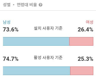 '유니콘' 앱의 성별 비율 그래프입니다. 설치 사용자 기준으로 남성 73.6%, 여성 26.4%로 남성의 비율이 더 높은 것으로 확인되었습니다. 활성 사용자 기준으로도 남성 74.7%, 여성 25.3%로 남성 비율이 높은 것으로 나타났으며 전반적인 비율 또한 유사한 수치입니다.