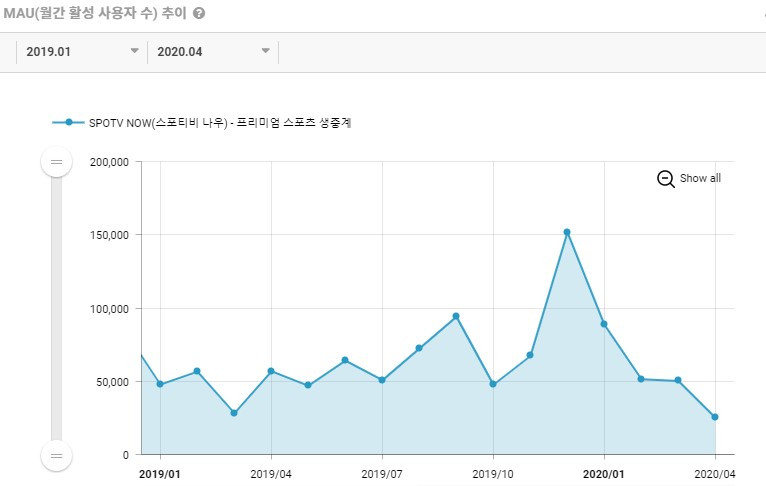 '스포티비 나우' 앱의 월간 설치 사용자 수 추이도 살펴보겠습니다. 대체적으로 활성 사용자 수 추이와 비슷한 형태이나 하락 추세가 조금 더 완만한 것을 볼 수 있습니다. 2019년 한 해 동안 꾸준히 성장을 해왔고 2020년 들어 살짝 주춤한 것을 확인할 수 있는데요. 최근 코로나 이슈가 조금 완화되면서 각종 스포츠에서 무관중 리그가 진행되거나 논의 중인데요. 오히려 스포츠 리그가 재개되면 다시 꾸준한 성장 곡선을 그리지 않을까 기대됩니다.