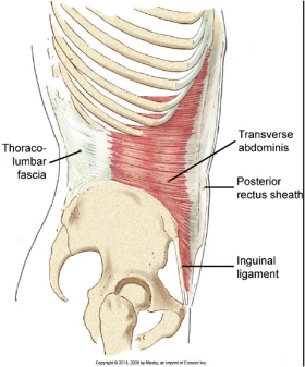 빨갛게 표시된 근육이 옆에서 본 복횡근의 모습입니다. 이 근육이 수축하게 되면 양 옆에서 깍지 끼듯 허리를 조여 복압을 높여 허리의 안정성을 높여줍니다.