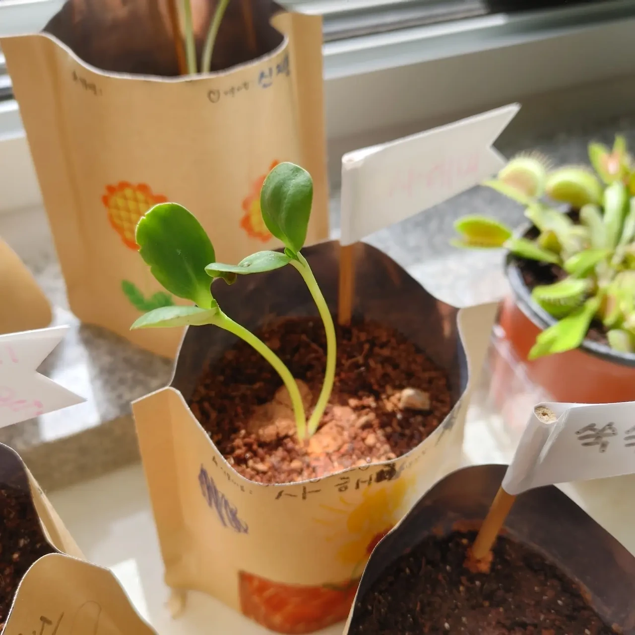 그러던 어느 날 싹이 텄다. 씨앗을 심은 지 2주 만이다. 아이들처럼 귀여운 작은 잎이 나왔다. 파릇파릇 생기가 돈다. 싹의 모양과 크기, 움튼 싹의 수도 달랐다. 마냥 신기해 넋 놓고 바라봤다.
