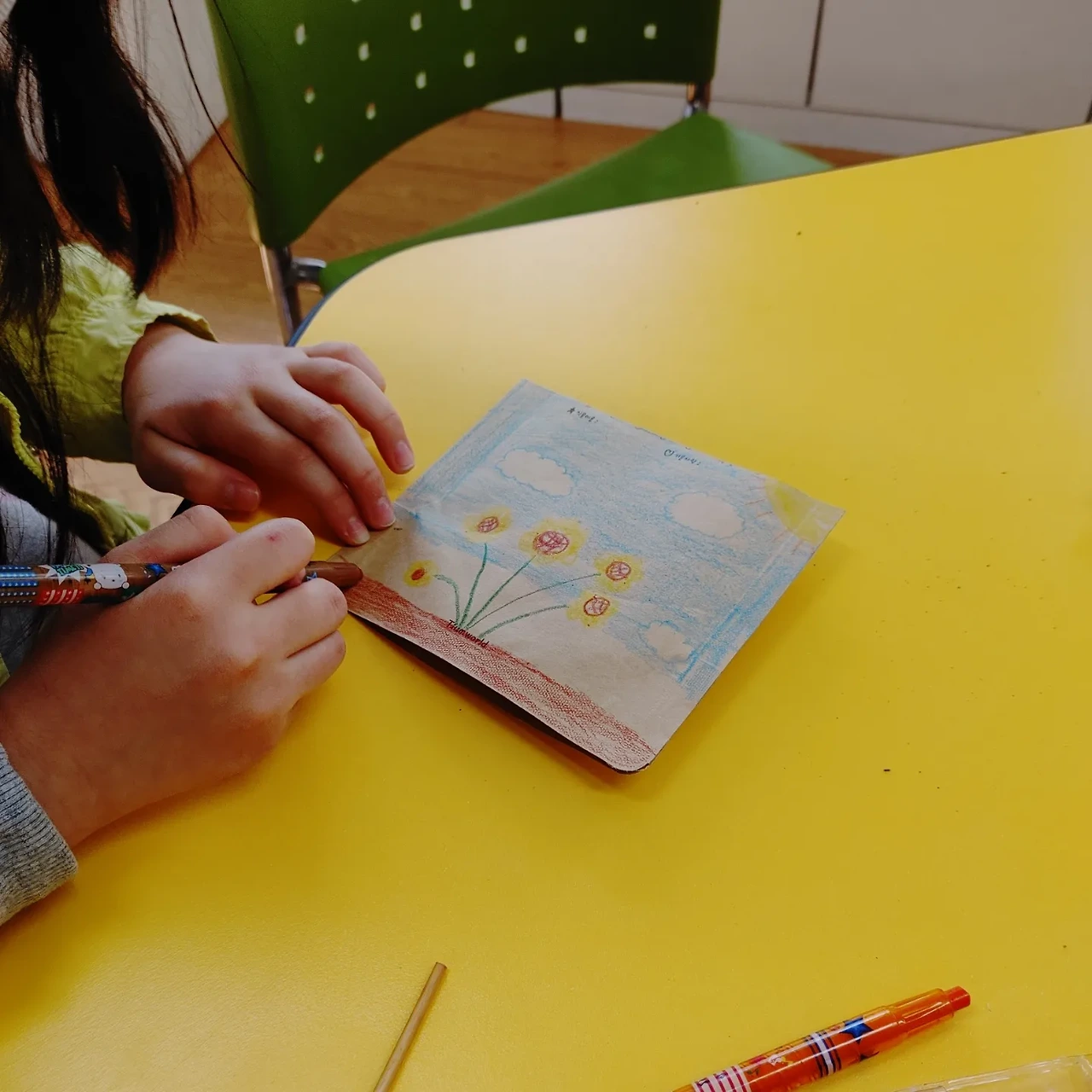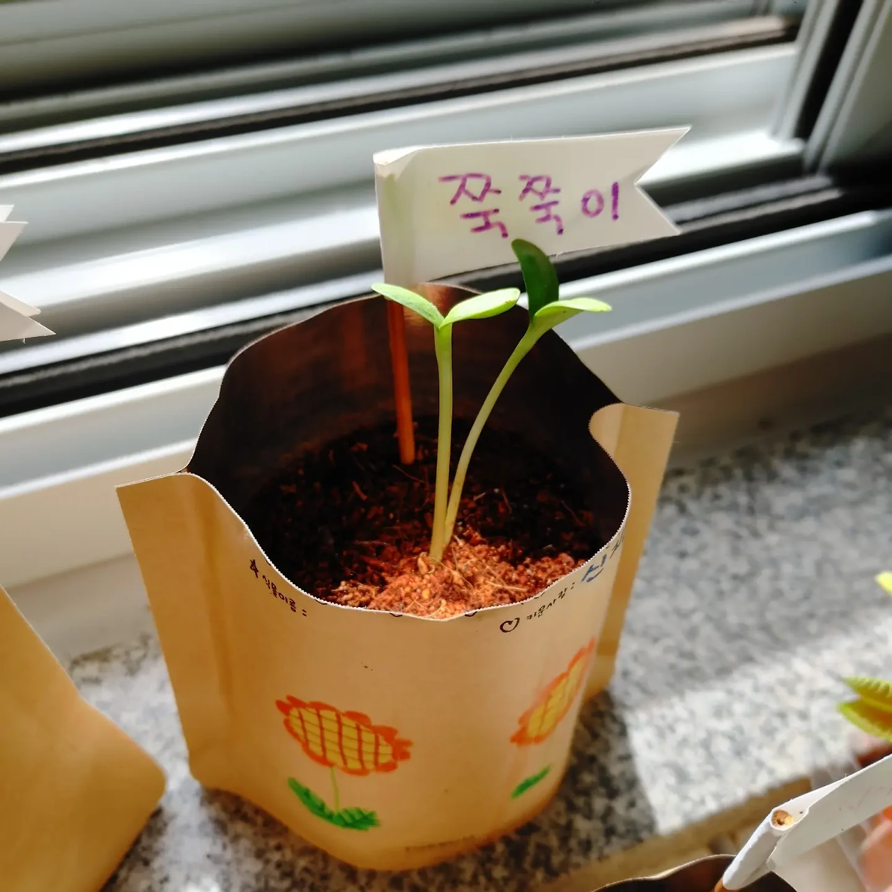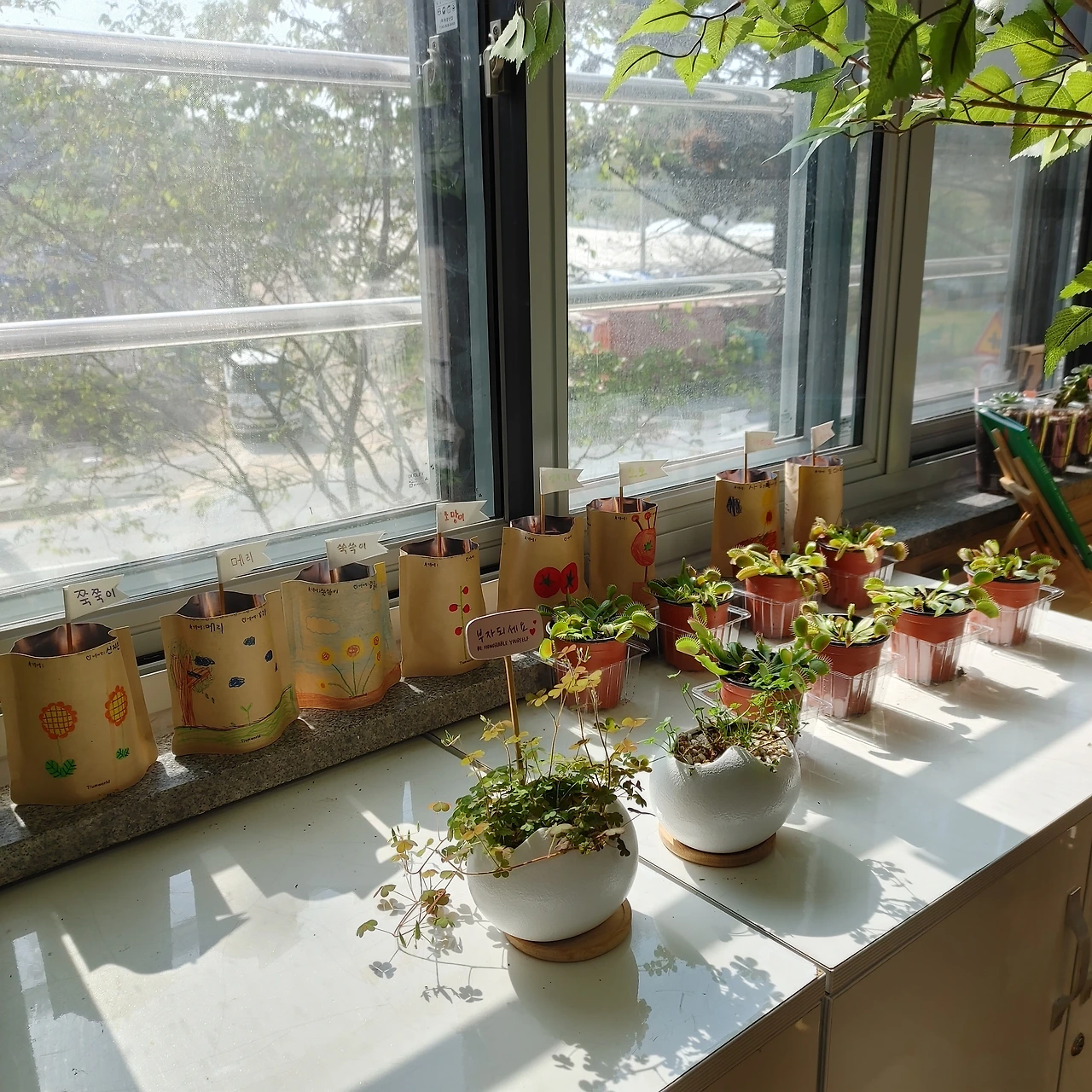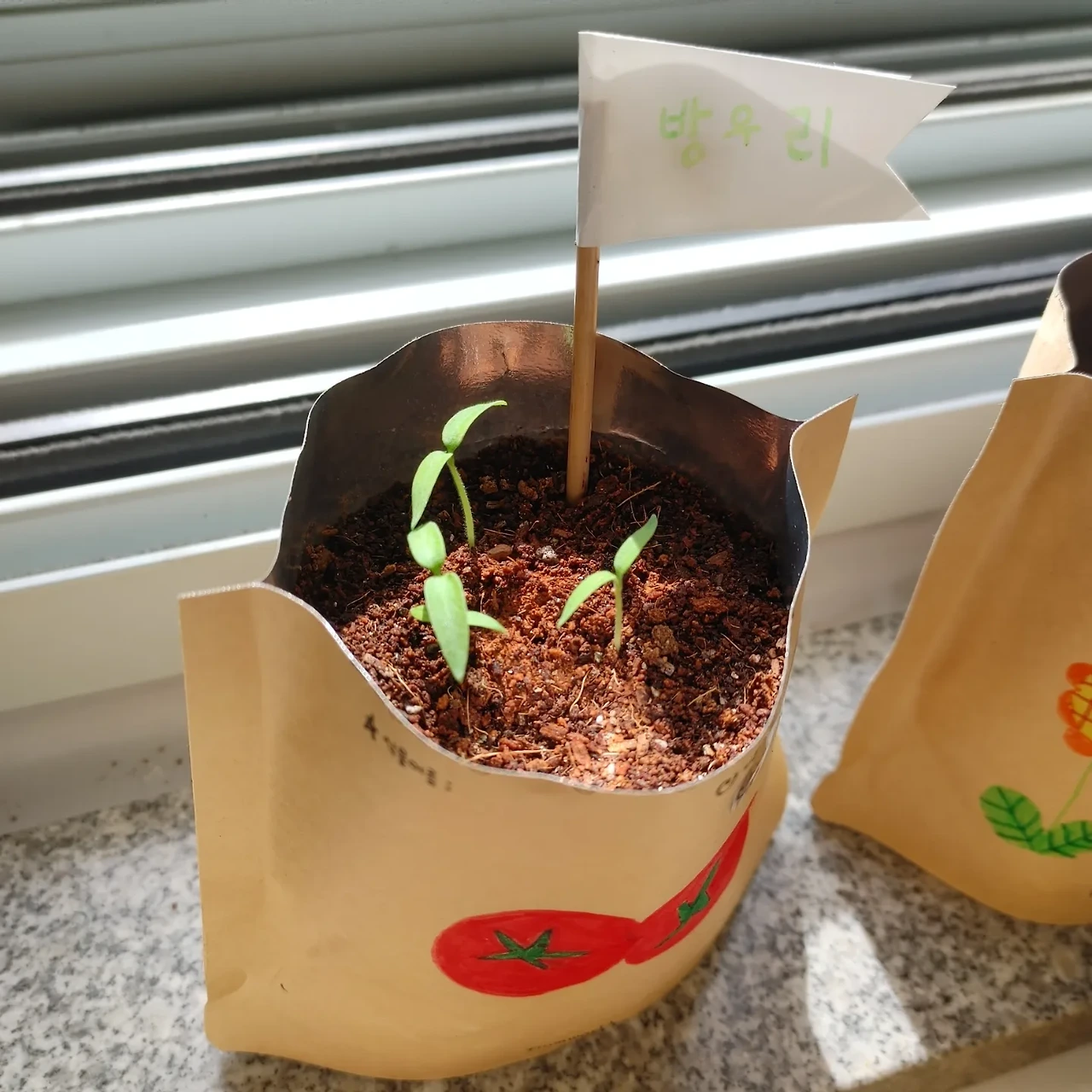 아이들과 봉투 화분에 그림을 그렸다. 잠시 생각하더니 색연필로 쓱쓱, 봉투 화분에 무언가를 그리기 시작했다. 아이들은 알록달록 저마다 다른 그림을 그렸다. 봉투에 배양토를 넣고 깃발이 꽂혀있는 황토볼을 꺼냈다. 소망을 담아 자기 식물의 이름을 지어 주었다. 아이들이 직접 씨앗이 있는 황토볼 깃발을 화분에 심었다. 흙을 꼭꼭 눌러 다듬고 종이컵에 물을 가득 채워 화분에 물을 주었다. 옹기종기 교육복지실 창가에 모여있는 화분이 앙증맞다. 세상에 하나뿐인 반려 식물이다.