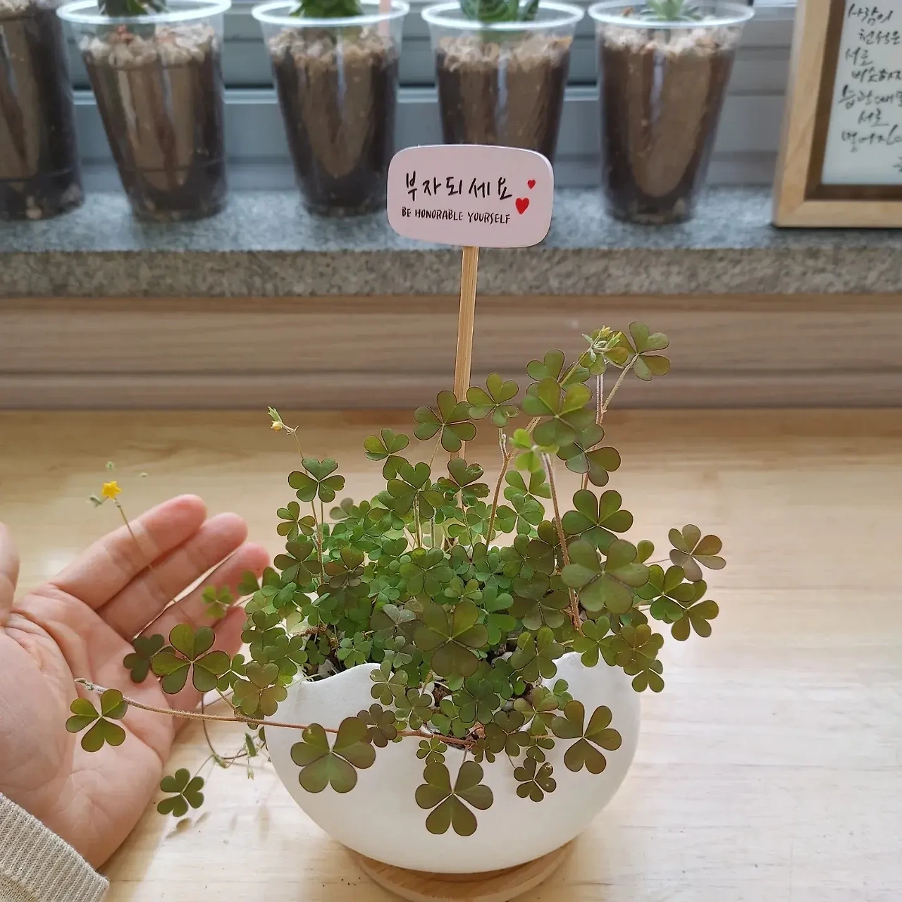 일주일이 지난 지금, 꽃대가 자라더니 세잎이 자랐다. 발아시키려는 수고를 무색하게 했다. 인간의 노력보다 자연의 순리가 위대한 순간이었다. 아무도 모르게 씨앗을 남기고 떠났을 줄이야 상상도 못 했다. 괭이 밥의 꽃말이 빛나는 마음, 기쁨이라고 한다. 다시 괭이 밥을 키울 수 있어 기쁘다. 꽃말처럼 괭이 밥이 기쁨을 선물했다. 또다시 교육복지실에 행복이 피었다.