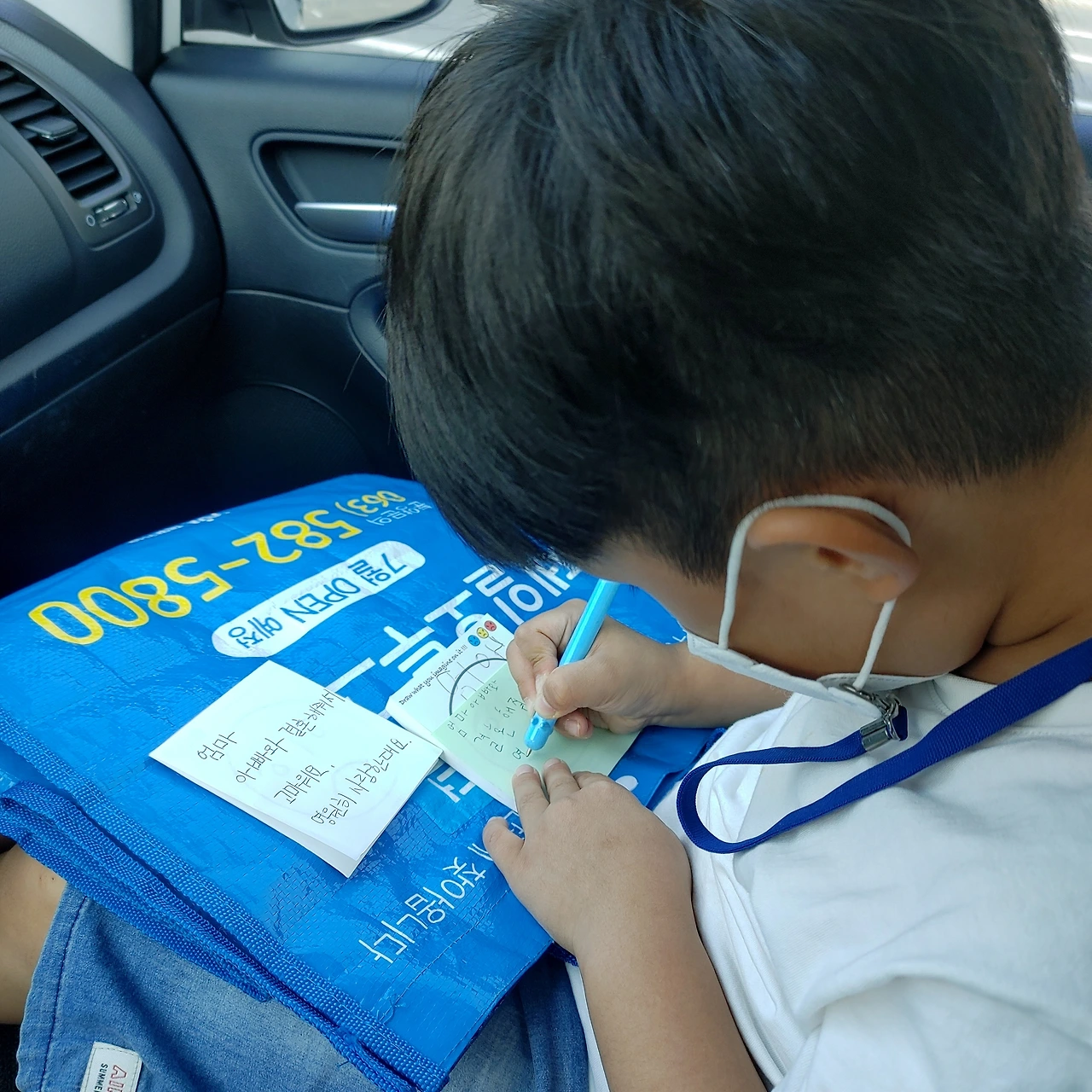 집으로 돌아가는 길에 아들에게 쪽지를 써달라고 했다. 아직 불러주는 대로 받아쓰지 못해 "엄마 아빠 결혼해줘서 고마워요. 영원히 사랑한대요."라고 포스트잇에 써줬다. 글을 보고 오히려 아들이 신났다. 뭘 아는지 나를 보고 씩 웃었다. 아들이 정성껏 포스트잇에 써줬다. 아들이 써준 글 덕분에 감동이 더 크게 밀려왔다.