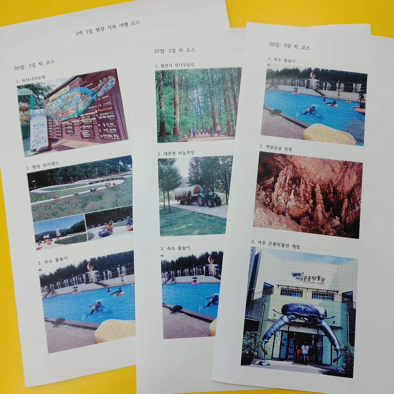 아이들이 좋아하는 것 일정으로 계획을 세우다 보니 뭔지 모르게 아쉬웠다. 모든 일정을 세우고 난 다음 프린트물로 뽑아보았다. 루지 타기, 동물 먹이 주기, 곤충(파충류) 체험 활동 아니면 물놀이였다. 아마도 아이들은 하루 종일 숙소에서 물놀이만 해도 좋아할 것이다.