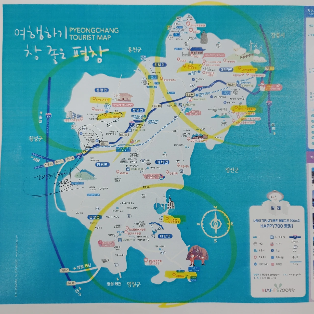 아이들과 놀러 갈 때도 마찬가지다. 시간대별로 계획하지 않으면 왠지 모르게 찜찜하다. 여행하기 일주일 전부터 2박 3일 가족 여행 일정을 짜기 시작했다. 우선 평창 군청 홈페이지에 들어가 여행지도를 다운로드했다. 숙박할 오리엔트 리조트 중심으로 블로그에서 추천한 몇 군데를 찾아봤다.