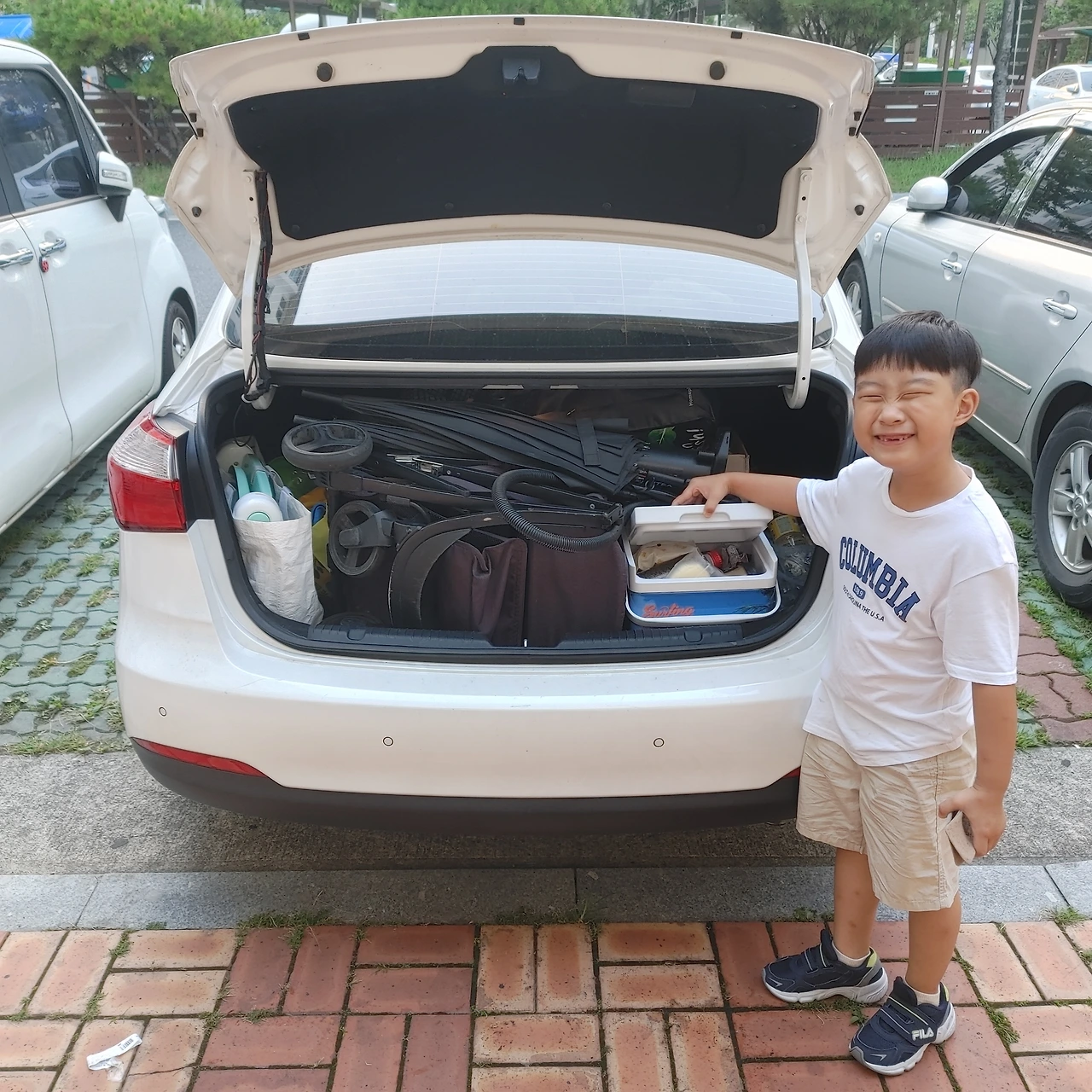 여행이 기대된다며 밤잠 설치던 첫째와 찰칵, 꾸역꾸역 짐을 싣고 다섯 식구가 탔다