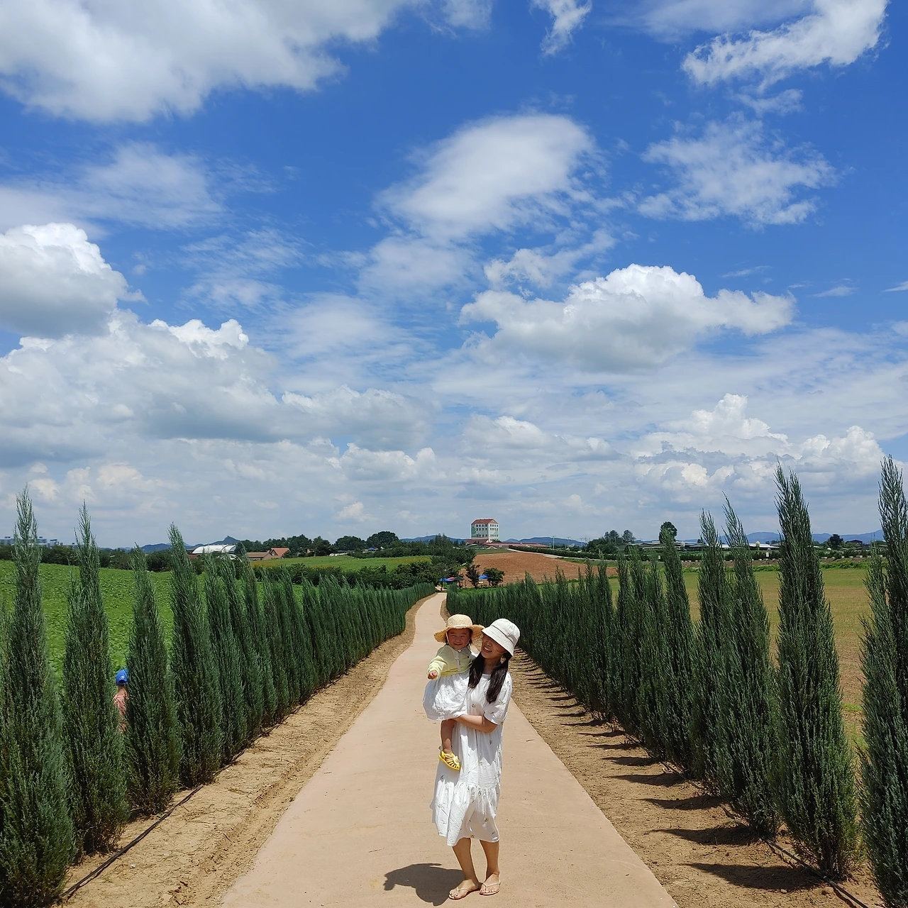 무려 4시간을 달려 허브나라 농원에 도착했다. 며칠 전만 해도 평창에 비 소식이 있었다. 출발하면서 걱정했는데 쨍쨍 내리쬐는 햇빛이 반겼다. 맑고 푸른 하늘에 바람마저 살랑살랑 가슴까지 시원했다. 톡톡. 딸내미도 기분이 좋았는지 선크림 바르는 내내 꼼짝하지 않고 얼굴을 대주었다. 딸내미 피부는 소중하니까.