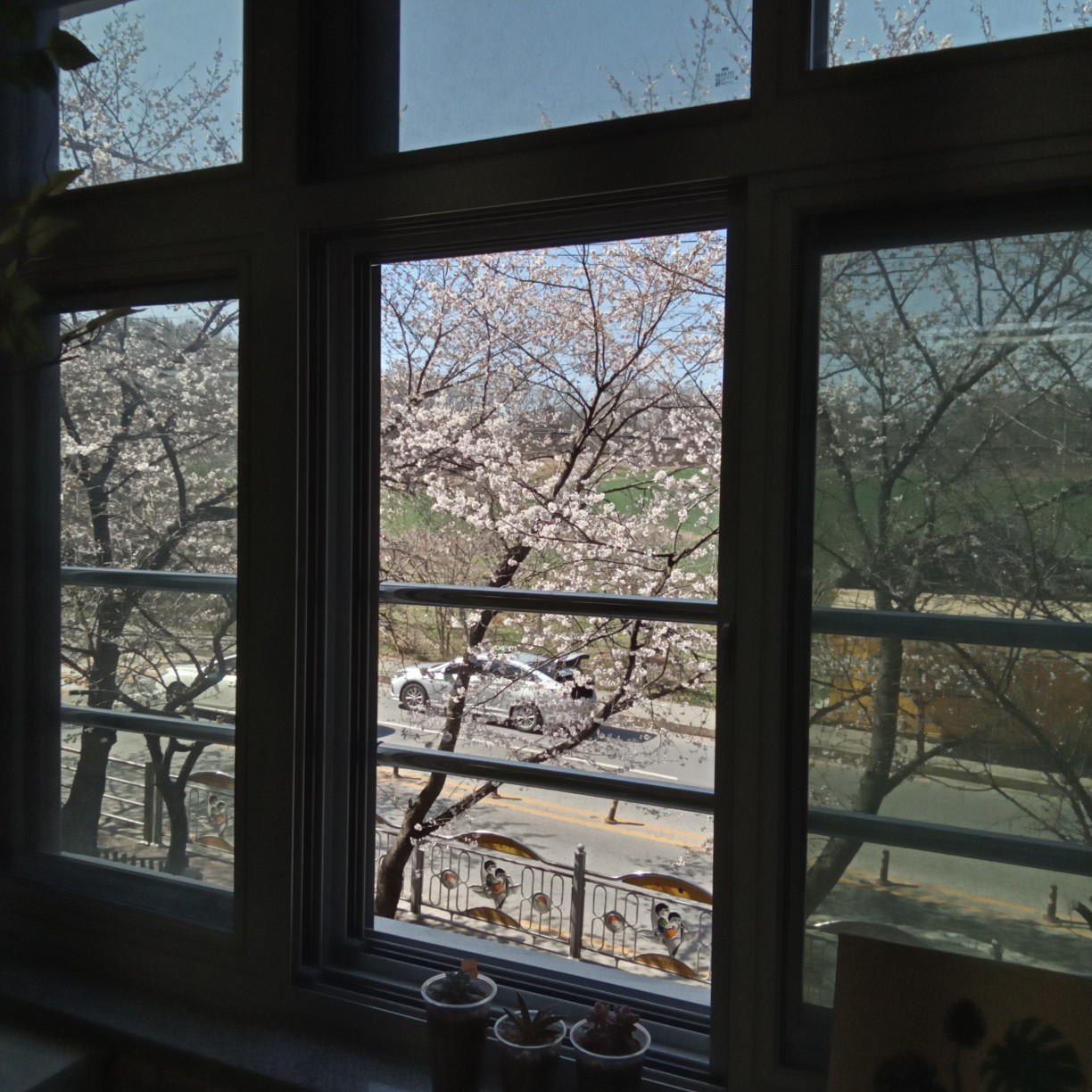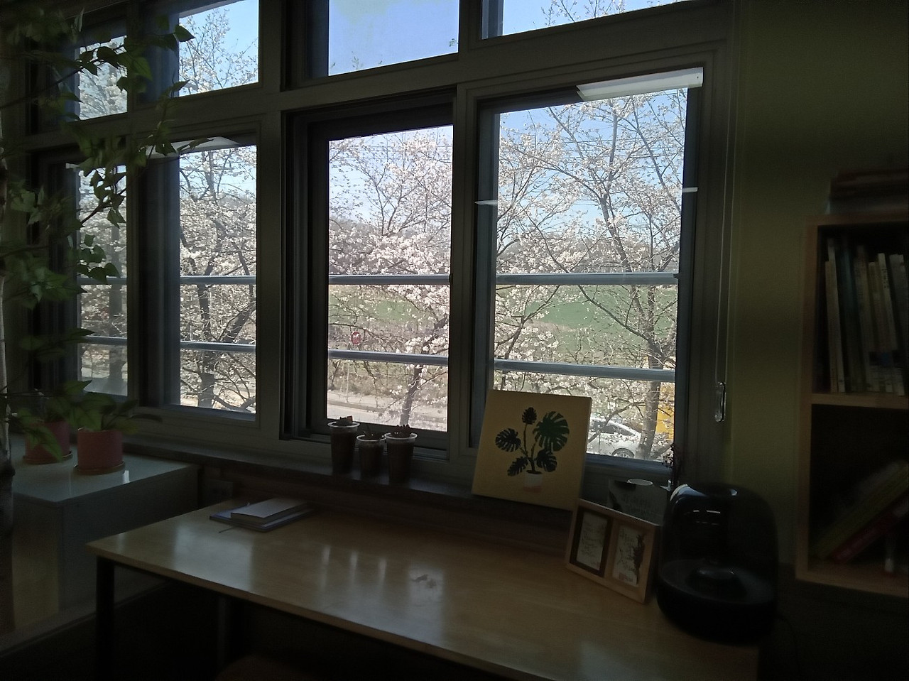 벚꽃에 벌이 날아든다. 자꾸 흔들리는 나뭇가지를 보고 있으니 살랑이는 바람이 느껴진다. 푸른 하늘에 떠있는 벚꽃에 사로잡혀 한동안 창밖을 쳐다봤다. 벚꽃뷰 교육복지실 바 테이블에 앉아 콘트라베이스 블랙커피를 마시니 월요일 병이 날아갔다.