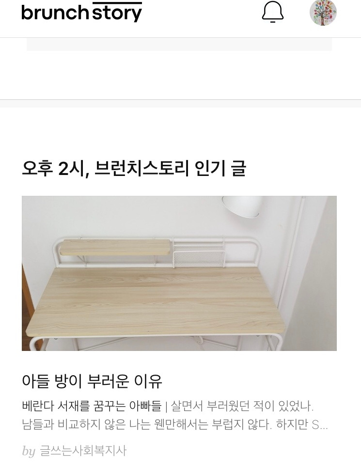 몇 주 전 방이 생긴 아들이 부럽다는 글을 발행했다. 글은 몇 분만에 실시간으로 노출됐다. 참 오랜만에 조회수가 터졌다. 언제 한 번 브런치 앱 인기글로 추천되면 좋겠다고 생각했는데 바람이 이루어진 것이다. 조회수가 쭉쭉 오르더니 결국 통계 랭킹 12위를 탈환했다. 아쉽지만 10위 권 안에는 들지 못했다.