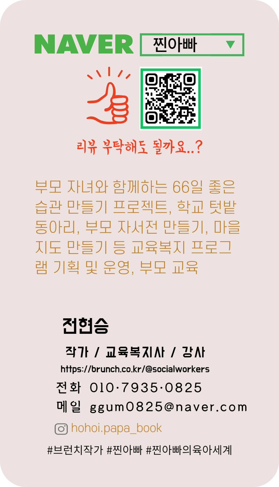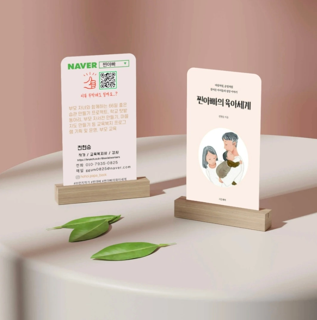 누가 보면 미래 직업 명함을 만들었다고 할지 모른다. 사실 희망 사항을 적었다. [찐아빠의 육아 세계] 책 출간을 계기로 강연을 하면 좋겠다고 생각했다. 지난 10년간의 교육복지사 경력을 바탕으로 육아와 관련된 주제에 대해 강연을 하고, 좋은 부모가 되기 위한 부모 역할을 나누면 되겠다 싶었다. 교육청에서 우수 사례로 선정된 "부모 자녀가 함께 하는 66일 좋은 습관 만들기 프로젝트"나 그동안 기획하고 운영했던 교육복지 프로그램들을 블로그에 공유하면 책을 알리는 데 도움 되겠지 생각했다. 육아 서적 리뷰나 육아하면서 책 쓰기 방법도 괜찮지 않나.