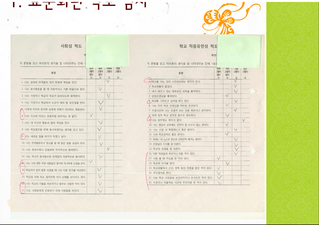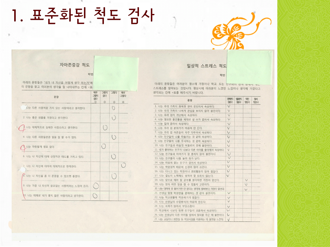 2015년~2016년은 학생 파악을 위해 표준화된 척도 검사지를 활용했다. 그 당시에는 사업의 방향을 정하고 있는 과도기 시기라 활용할 도구나 자료가 지금처럼 많지 않았다. 학교에서 학생 파악의 근거를 요구했고 [사회복지 척도집] 책을 참고로 표준화 척도 검사지로 정했다.