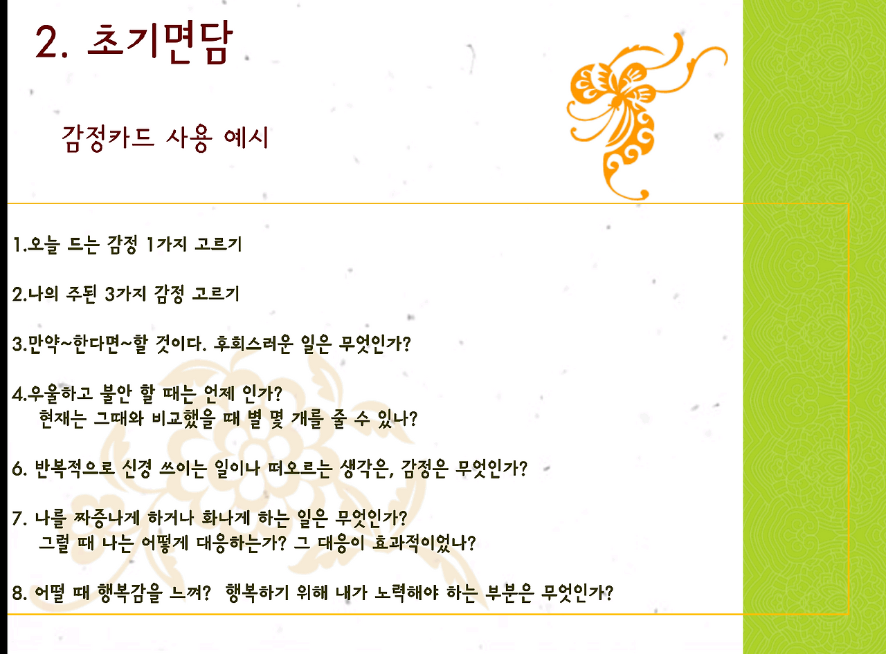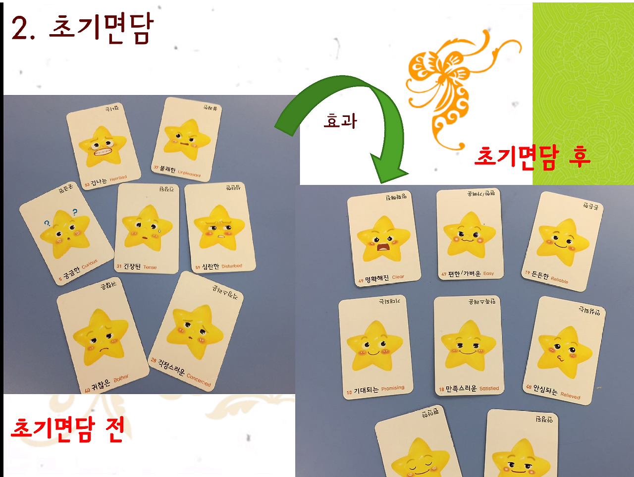 초기면담은 관계의 첫 단추였다. 학생들의 굳게 닫힌 마음의 문을 열 수 있었다. 한 명 당 45분 동안 초기면담을 진행했다. 주로 감정카드를 사용했다.
