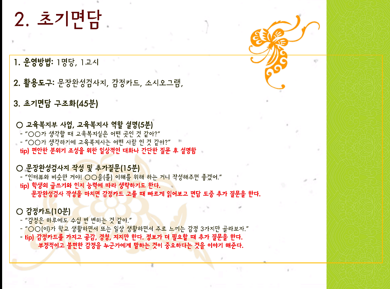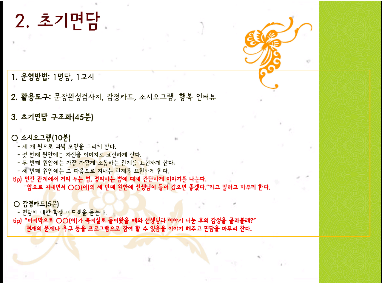 초기면담은 학생과의 관계를 시작하는 첫 관문이다. 이때 어떻게 하느냐에 따라 이후 관계가 결정된다. 또한 비자발적인 학생의 태도를 바꿀 수 있는 기회이다.