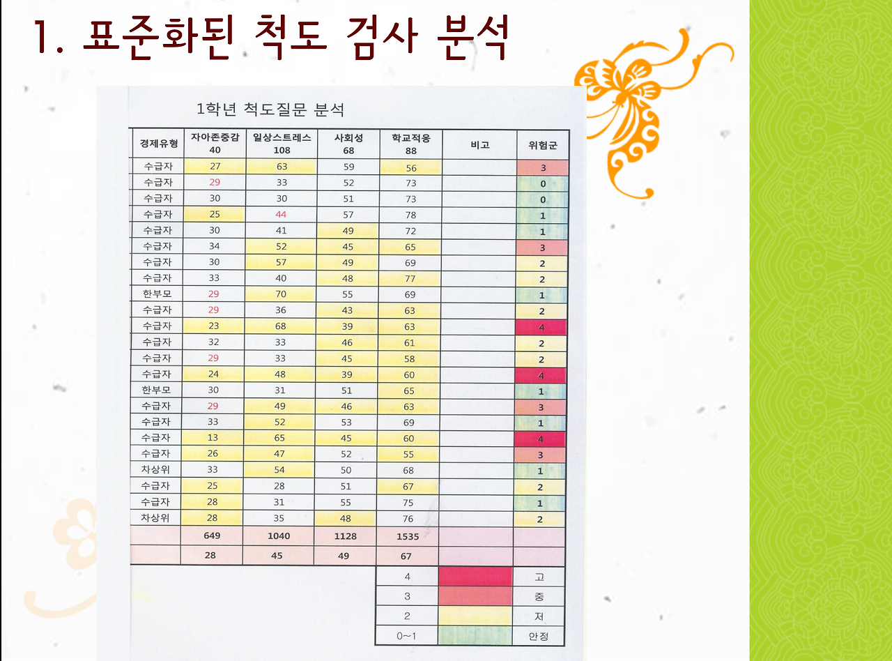 표준화된 척도 질문지를 분석하는 데 상당한 시간이 걸렸다. 척도 간에 평균을 내서 학년 별로 상대 비교를 했다. 신기하게도 고위험(지금은 1순위라는 표현을 사용한다)에 선별된 학생은 실제로도 문제나 어려움을 겪고 있었다. 검사지 사용 장점은 객관적인 근거가 될 수 있다. 평균값과 학생들의 수치를 알 수 있어 상대적인 비교가 수월했다. 사례회의 중 선생님들의 신뢰도가 높았다.