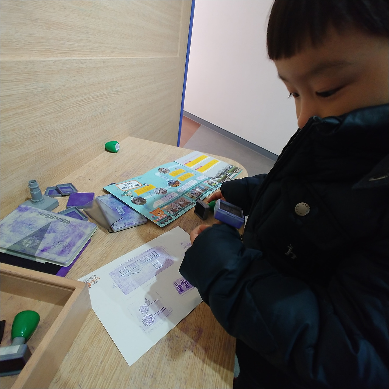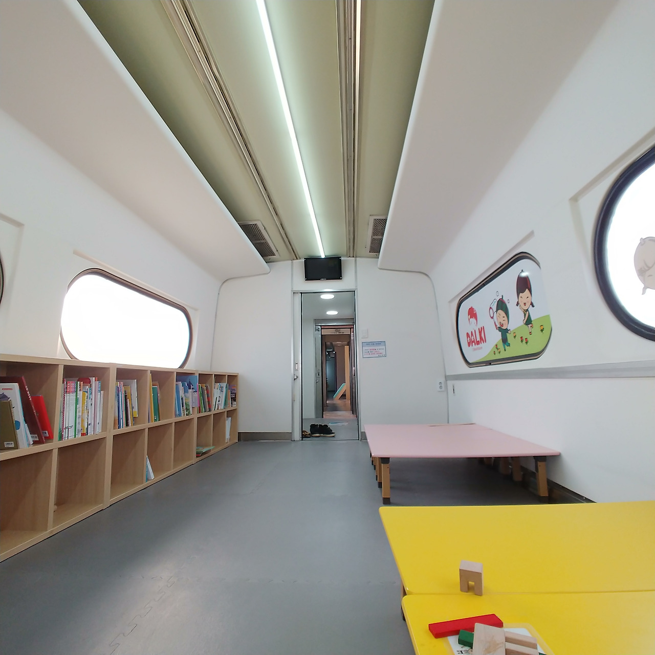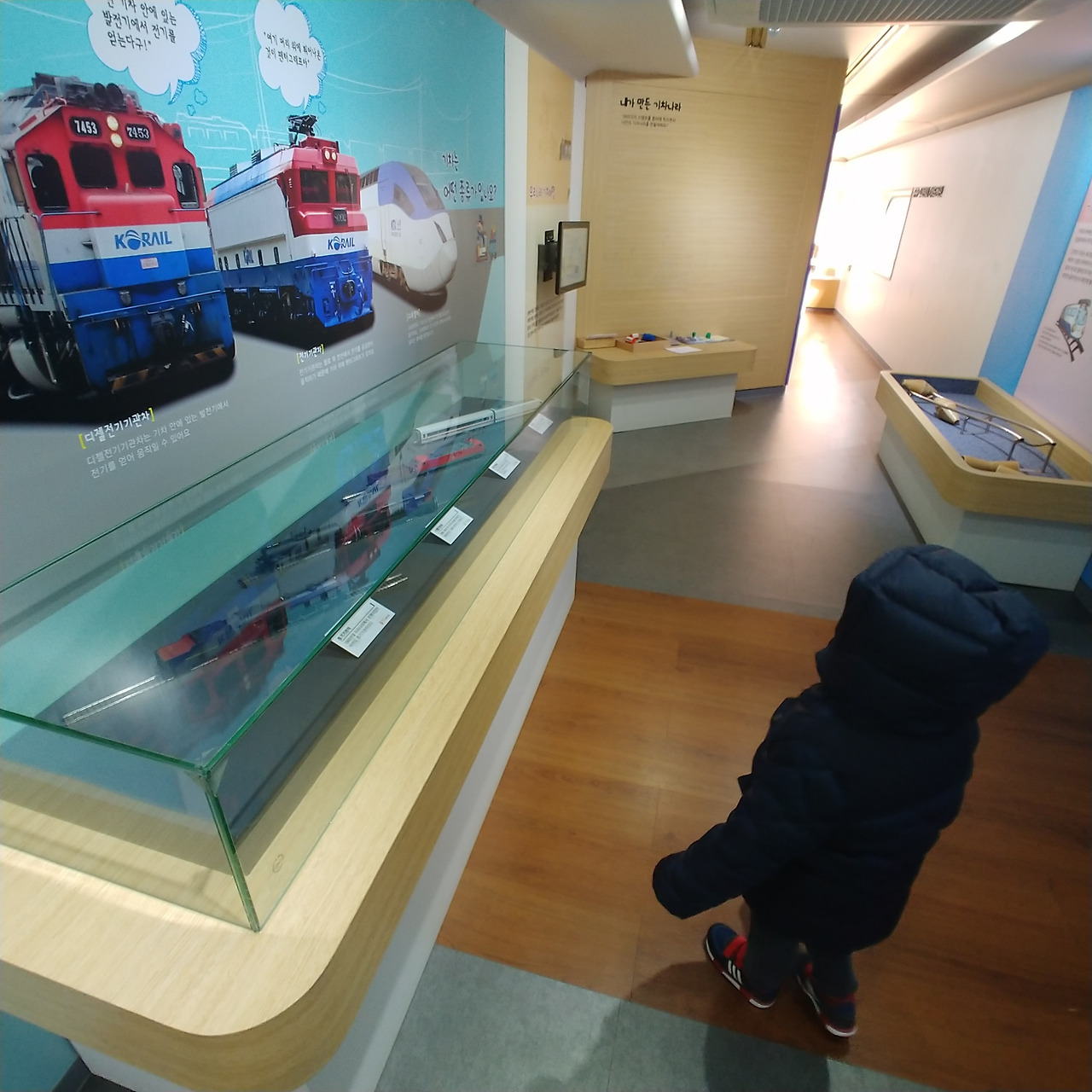 본격적인 기차 안을 구경할 차례다. 전체 구간이 기차 네 개 칸으로 이루어져 있고 칸칸이 마다 테마가 달랐다. 기차 종류에 대한 소개부터 책 읽는 공간, 놀이할 수 있는 공간이 마련되어 있다. 아들이 뽀로로 캐릭터가 안전예방 교육을 하는 장면에서 오랫동안 머물며 유심히 살펴봤다.