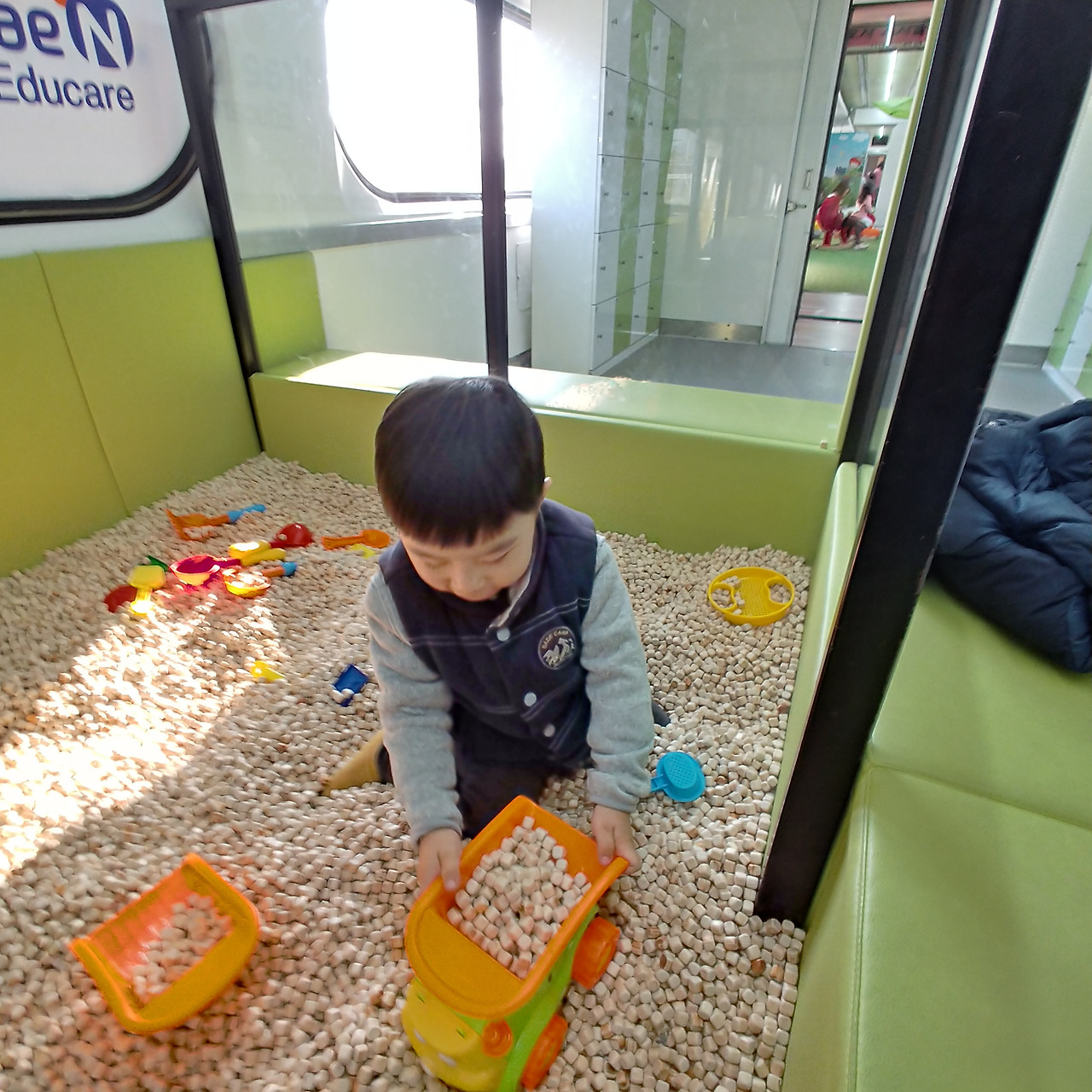 기차 제일 마지막 칸의 모습이다. 키즈 카페 모습과 비슷하다. 조금 아쉽지만 그 공간에서는 최선임을 이해한다. 아무튼 아들과 나는 이곳에서 오랫동안 머물렀다. 중장비에 빠진 아들은 굴삭기와 트럭만 있으면 한참을 논다. 요즘 1인 2역을 하는 덕에 아들을 지켜보면 웃긴다. 맥락과 상황에 전혀 맞지 않는 말을 어쩜 그렇게 잘 이어 붙이는지 놀랍기만 하다.