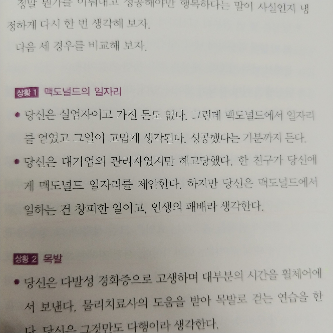 기대는 주관적인 가치 판단에 따라 결정된다. 내가 진정으로 원하는 삶인가를 스스로 질문하고 찾아야 한다. 우리는 주변의 기대에 부응하기 위해 살아왔고 살아가기 때문에 고단하다. 그래서 삶이 고달프다. 나와 다른 사람과 비교하면서 내가 가지지 못한 것에 대한 상대적 박탈감을 느낀다. 그 박탈감은 말로 표현할 수 없다. 비참하고 수치스럽다. 그렇게 쪼그라든 나를 벼랑 끝으로 몰아세우는 것도 역시 나다.