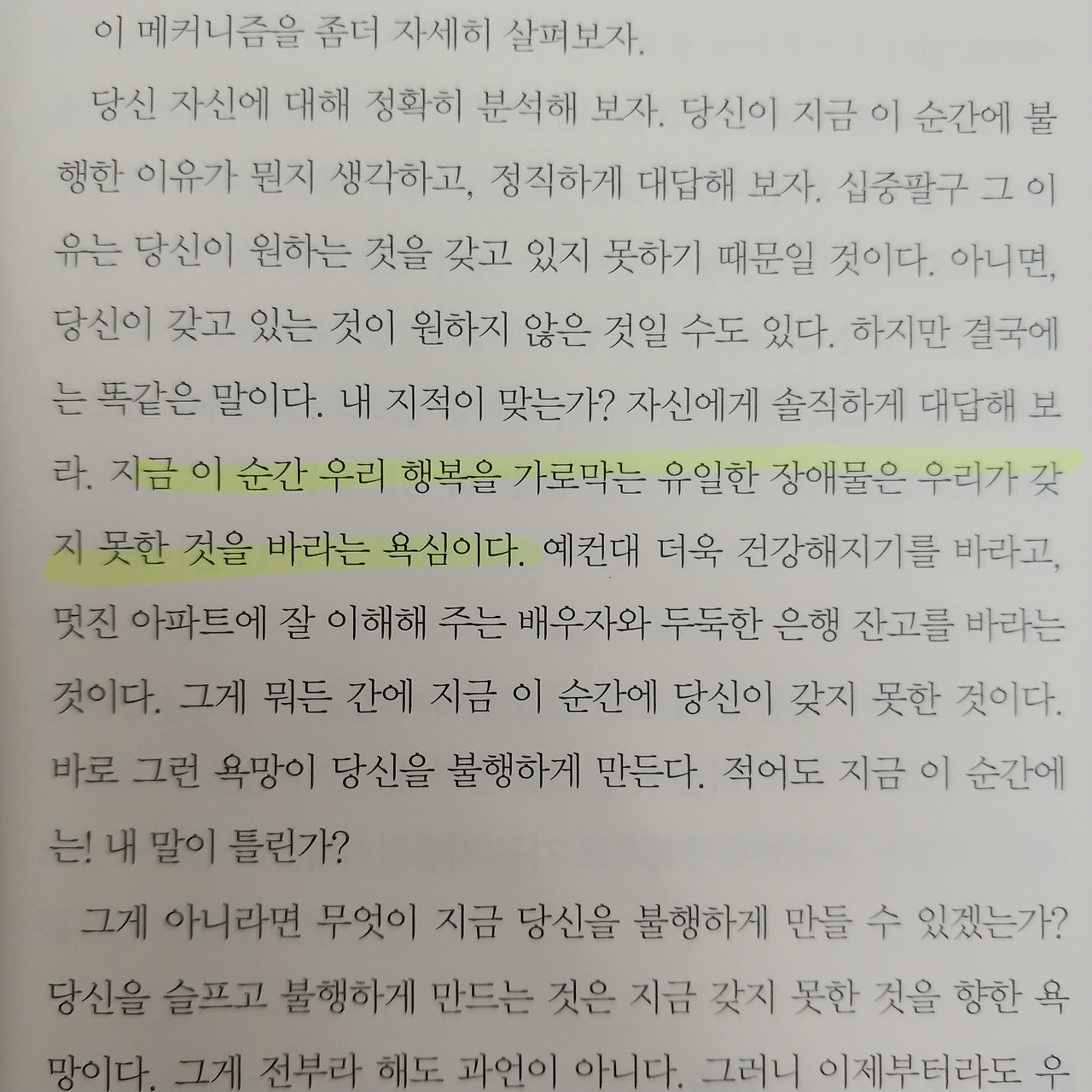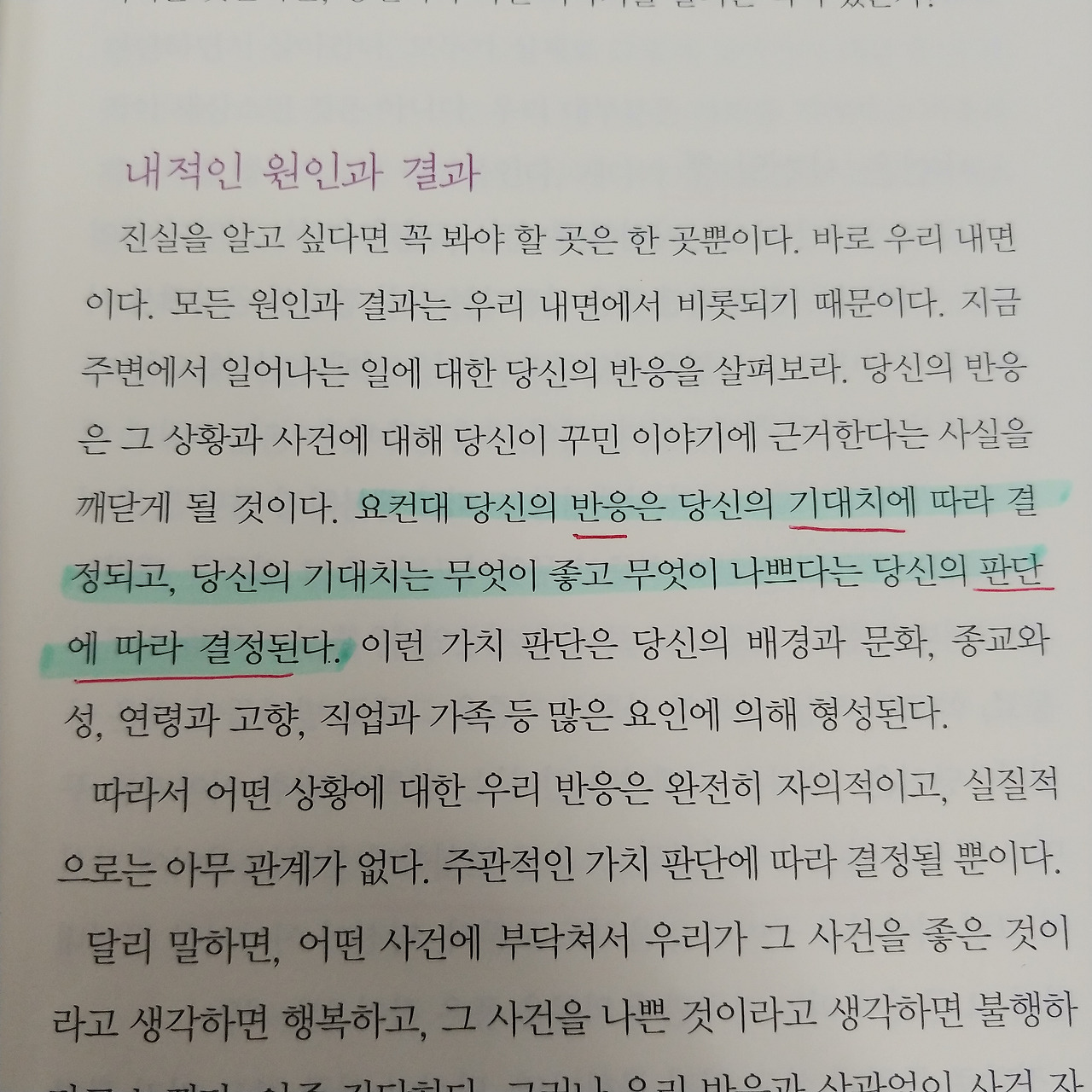 기대의 기준을 바로 세우는 것이 불행을 걷어 내는 일이다. 타인의 기준을 좇다 보면 이도 저도 안 된다. 타인의 기준은 나를 속일 수 있다. 같은 사건, 경험이지만 다른 반응을 보이는 것처럼 거짓일 수 있다. 거짓 기대심리에 현혹되지 않아야 비로소 행복할 수 있다.