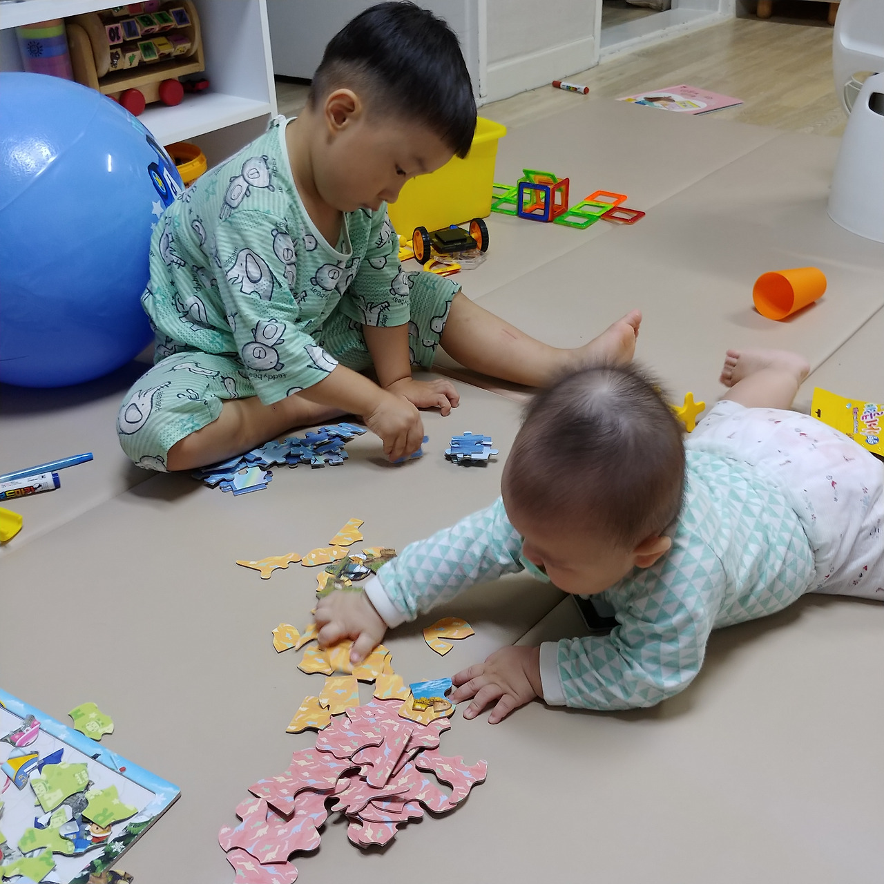 둘째 태교는 첫째가 했다. 그나마 다행이라고 생각한다. 첫째 임신 때와 다르게 오롯이 태교 집중하지 못했다. 퇴근하면 첫째와 놀기 바빴고 첫째를 재우면 하루가 지나갔다. 상대적으로 둘째에게 신경 쓰지 못했다. 그럼에도 불구하고 잘 커준 둘째가 고맙다. 첫째가 불러오는 배에 대고 노래도 불러주고 재잘재잘 떠들었다. 그래서인지 몰라도 내 목소리보다 첫째 목소리에 반응을 잘했다. 둘째가 7개월이 되면서 형과 놀기를 좋아한다. 둘째를 안고 있으면 첫째가 우스꽝스러운 표정과 소리로 다가오는데. 형을 보고 "꺄악, 꺄악, 꺄악" 자지러지며 웃는다. 아직 스스로 못 걸어서 그렇지 걷게 되면 둘째 역시 엄청난 장난꾸러기가 될 것 같다. 다른 사람과의 상호작용이랄까, 첫째가 하는 말과 행동에 뭔가 아는 눈치인 둘째가 마냥 신기하다. 예전의 누워서 멀뚱멀뚱 눈만 떴을 때와는 전혀 다르다.