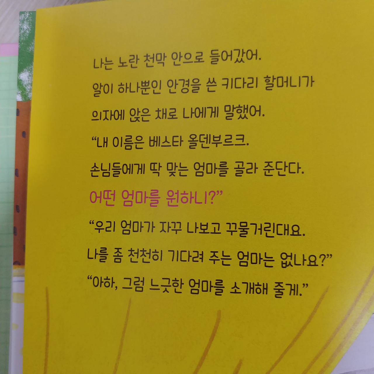 노란 천막으로 들어간 아이, 안경을 쓴 키다리 할머니가 아이에게 "어떤 엄마를 원하니?라고 묻는다. 천천히 나를 기다려주는 엄마를 원하는 아이의 말을 듣고 키다리 할머니는 엄마를 거북이 엄마로 바꿔준다. 느릿느릿 여유 넘치는 엄마는 아이보다 늦게 일어나 결국 아이는 학교에 늦게 가게 된다.