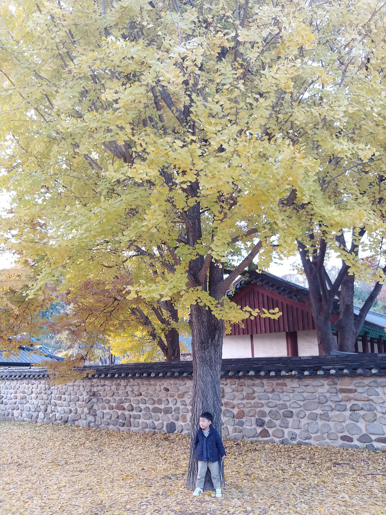 작가의 서랍에 잠시 저장해둔 사진. 지금 꺼내놓기 참 민망하지만. 어쨌든 11월 노랗게 물든 은행나무가 멋들어진 어느 날, 아들과 단둘이 전주 향교와 한옥마을에 놀러 갔었다. 전주에 살면서도 처음 가본 향교. 가을이 되면 아들과 가봐야겠다는 생각을 하고 있었다. 마침 어린이집에서도 야외 수업으로 향교에 다녀왔다. "노랗게 노랗게 물들었네 파랗게 파랗게 물들었네." 아들이 흥얼거리는 콧노래는 가을을 알렸다. 향교에는 수 백 년을 산 은행나무들로 가득하다. 알록달록 짙게 물든 잎들은 깊은 가을을 뽐내고 있었다.